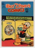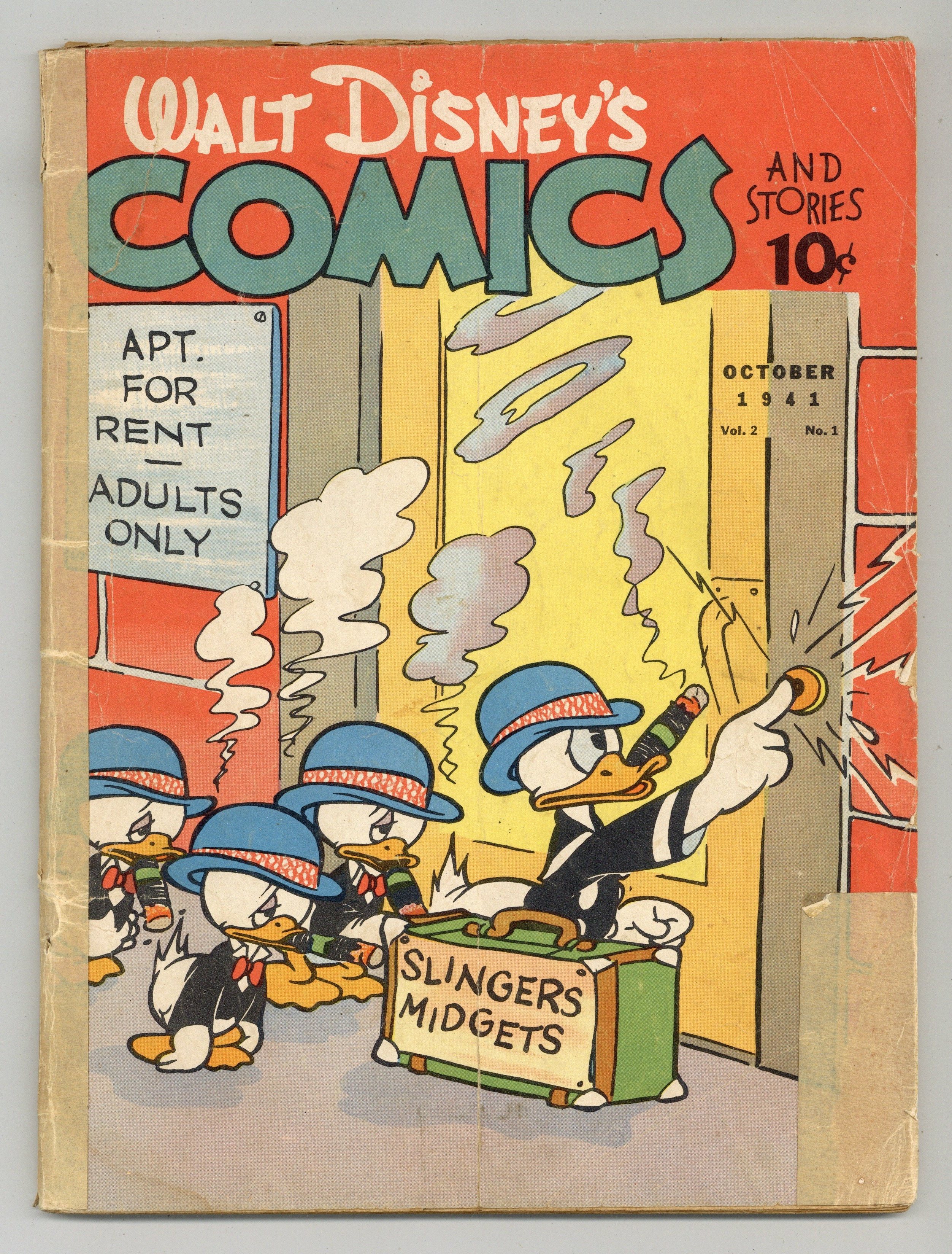 Tags: Disney Ducks & MicePublished May 1942 by Dell/Gold Key.$200.00- 1" spine split from bottom. Cover and two center wraps detached. Taped spine. Tearing on back cover. Water spotting.