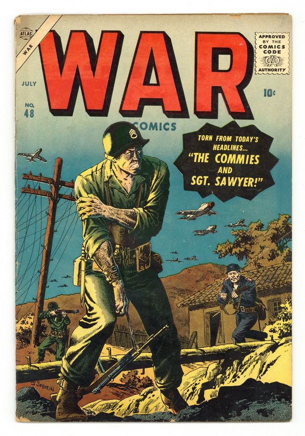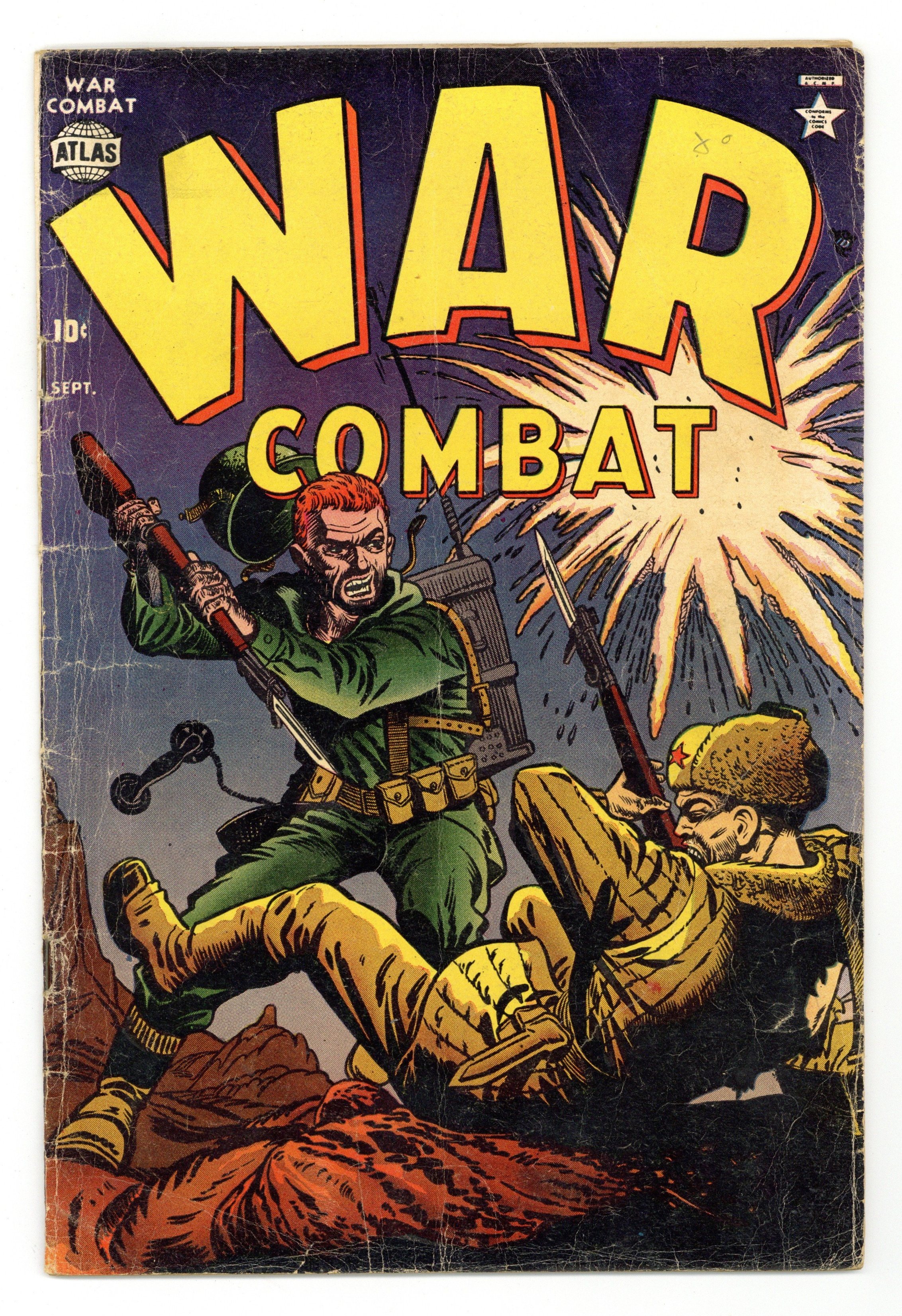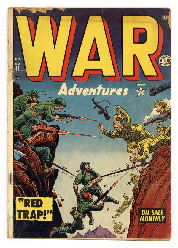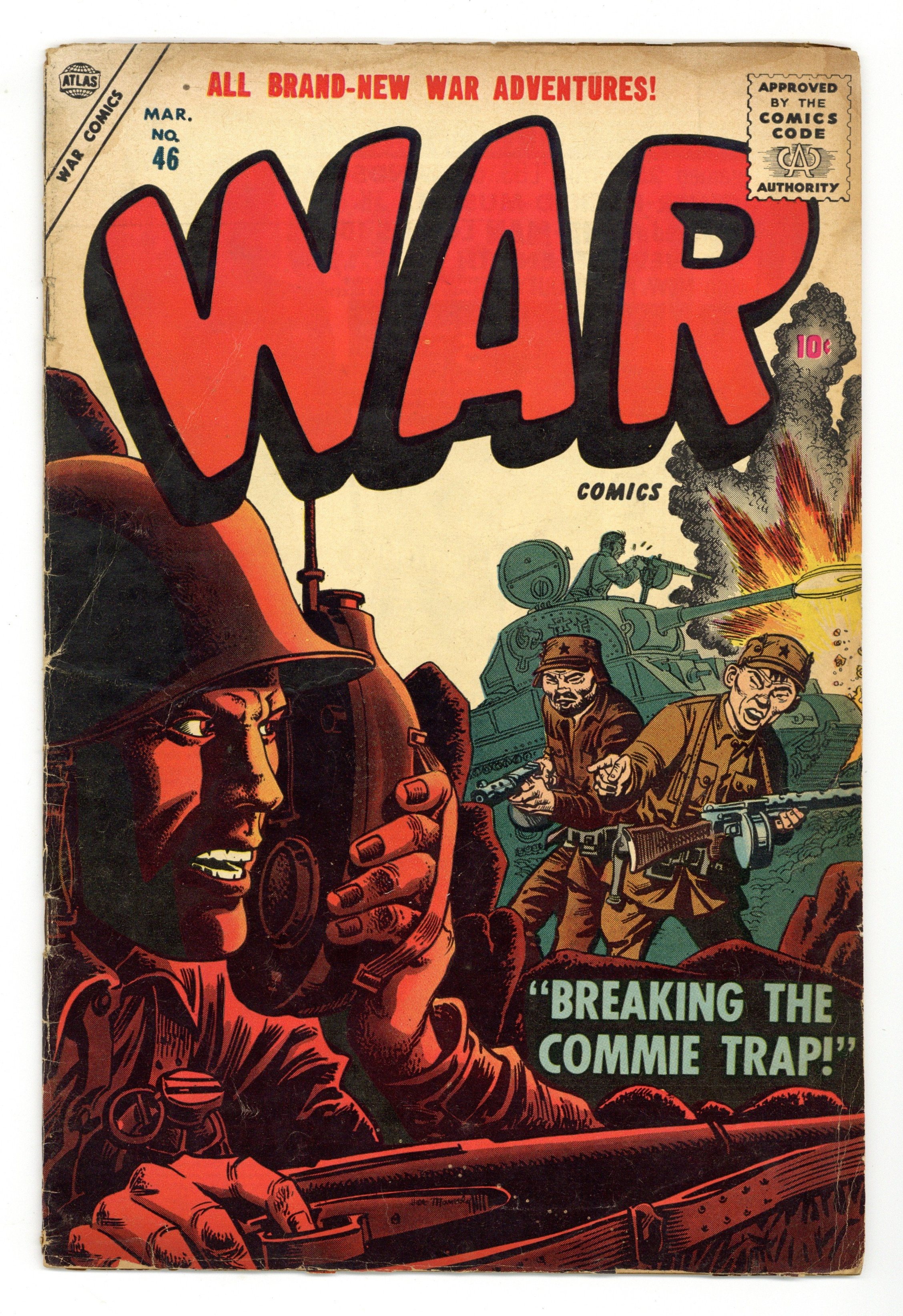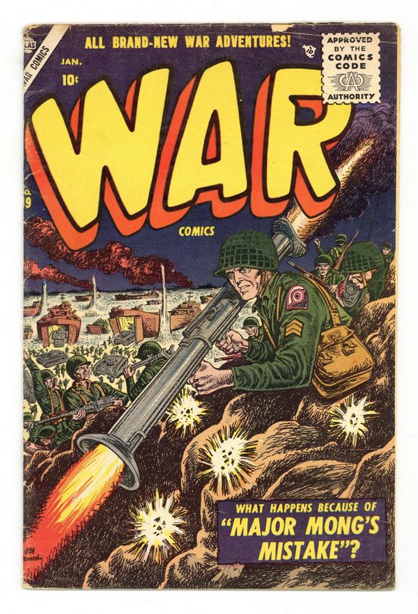 "Major Mong's Mistake," "No Place to Turn" (art by Mac Pakula), "Smash-Thru," "The Forgotten Man" (art by Gene Colan?), "Raid on Red China" (art by Vic Carabotta), and a two-page text story, "The Rescue!" Joe Maneely cover. Cover price $0.10.