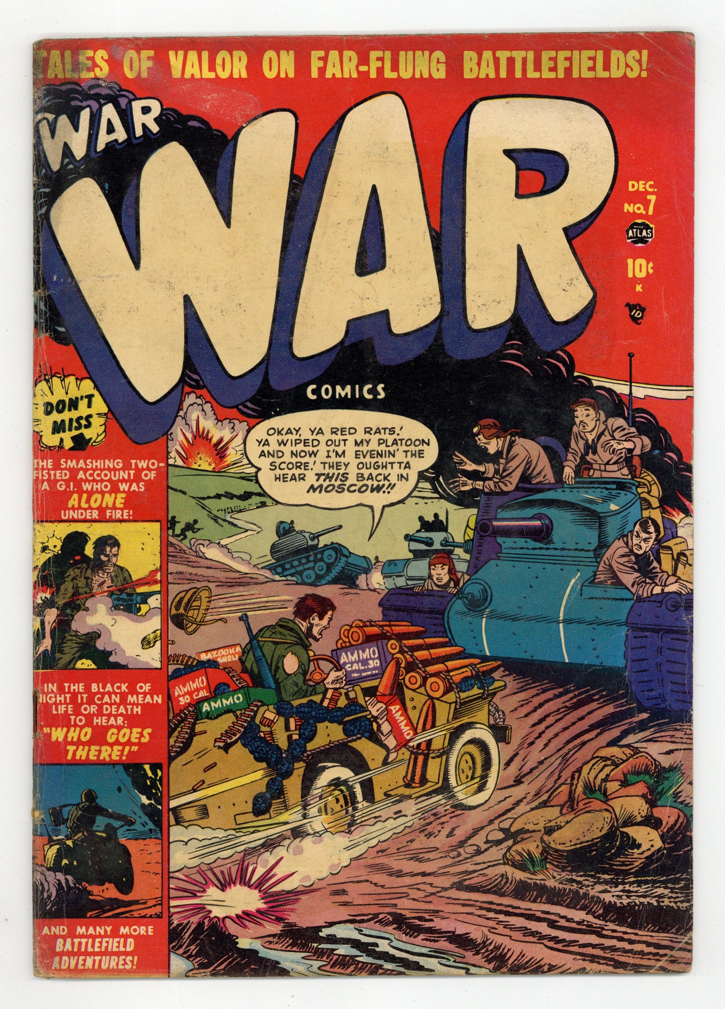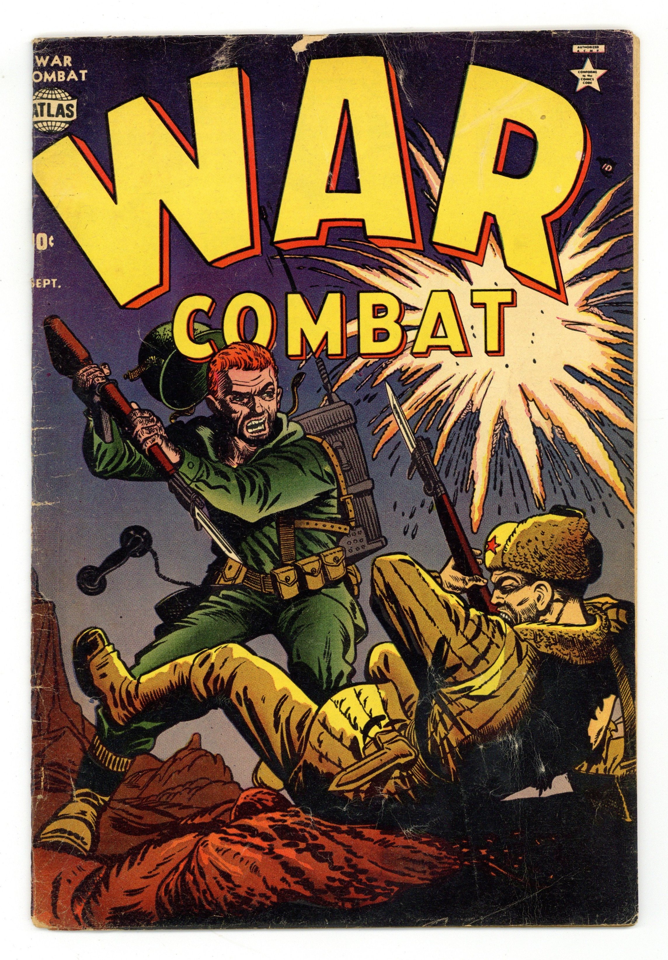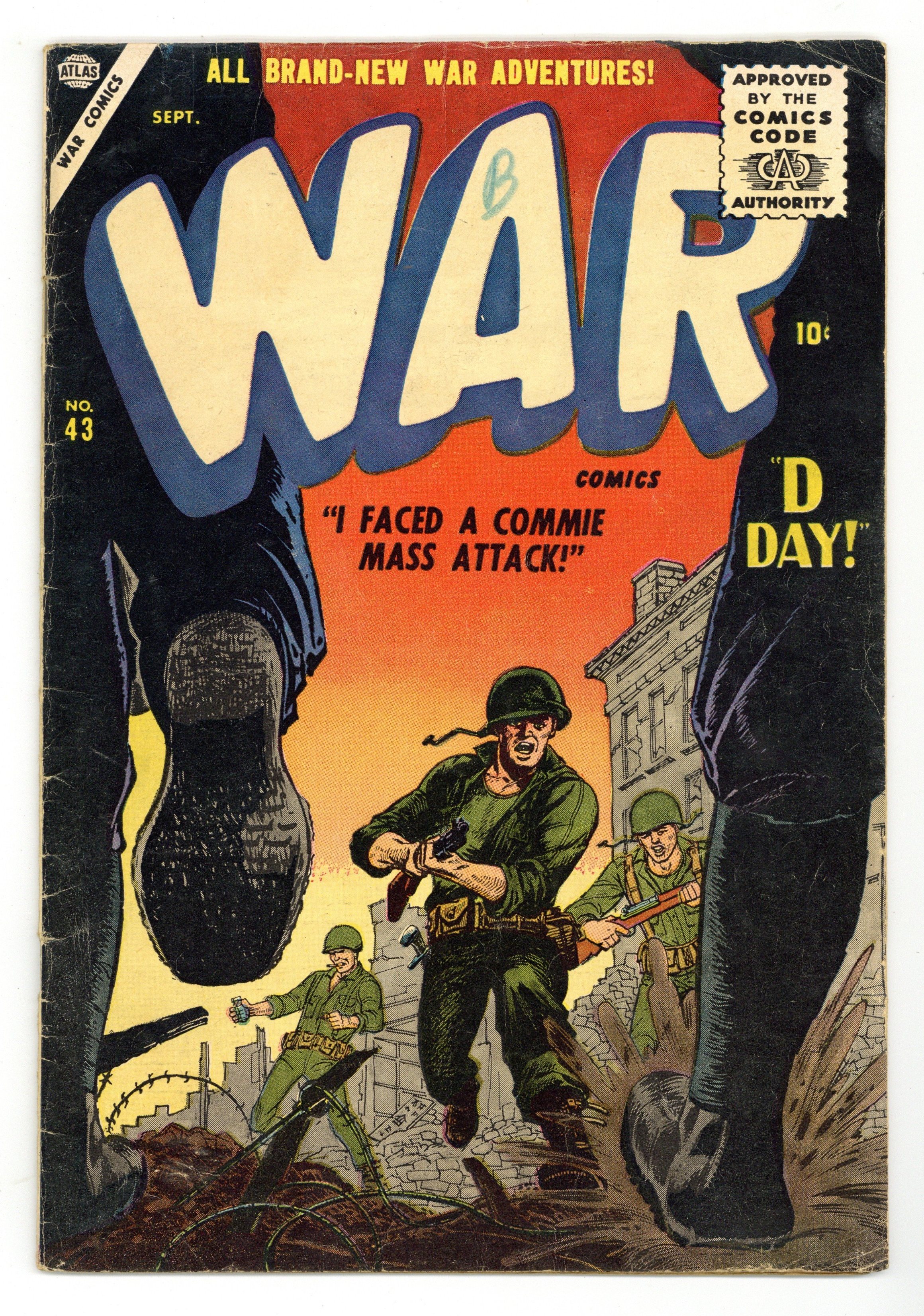 "Major Mong's Mistake," "No Place to Turn" (art by Mac Pakula), "Smash-Thru," "The Forgotten Man" (art by Gene Colan?), "Raid on Red China" (art by Vic Carabotta), and a two-page text story, "The Rescue!" Joe Maneely cover. Cover price $0.10.