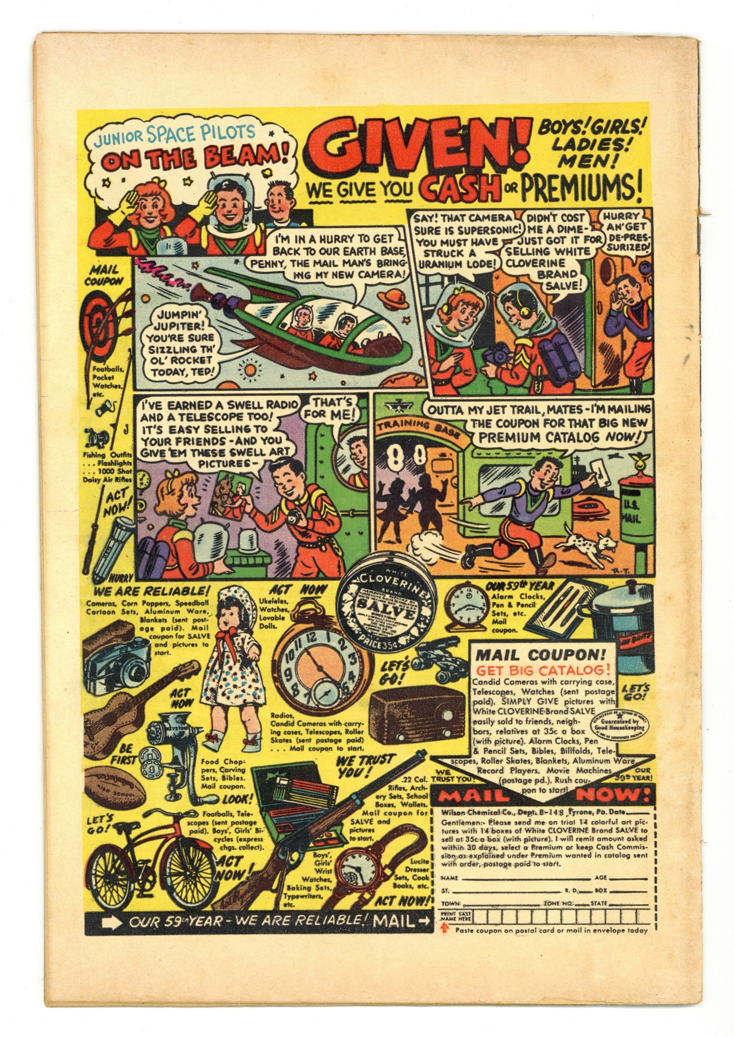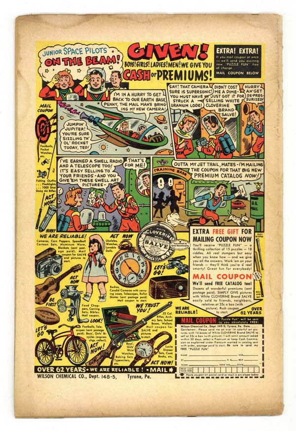 Cover art by Al Feldstein. "Space-Warp," script by Bill Gaines (plot) and Al Feldstein (plot, script), art by Al Feldstein; Frank readies himself for a monumental two-year journey to Altair, using the invention of Professor Hartlow: the Space-Warp Drive, which makes use of the theory that space is curved, and, that by entering into the 4th Dimension, one can travel great distances in a relatively short period of time. "The Dimension Translator," script and art by Harvey Kurtzman; Willy has created a dimension translator, which can translate a series of photos into an electric impulse and through a series of other processes, creates an actual three dimensional object; His boss does not like his research engineer "wasting the company's time" on such things...so Willy uses a photo of his boss to create a three dimensional figure of Mr. Bankbuck so that Willy can slap him around and get even. Tales From the Crypt ad. "Experiment" text story. Picture Stories From the Bible ad. "And Then There Were Two!", script by Bill Gaines (plot) and Al Feldstein (plot, script), art by Jack Kamen; American soldiers land on an atoll, ordered to remove any native inhabitants so that the U.S. government could conduct a hydrogen bomb test there; The natives have told the government that iron gods live on the atoll and soon the soldiers discover two of these "gods" (actually robots), which tell the men of their creator, and then are taken back to America. "Rescued!", script by Wally Wood (plot) and Al Feldstein (script), art by Wally Wood; A crew had been sent into space a year earlier to examine a planet in the solar system of a neighboring star; Upon discovering it, and noting it was about the size of the Earth, they landed next to the ship of the previous expedition two years earlier; Then and there they discovered was had happened to the previous expedition and what would happen to theirs. No cover number. NOTE: See #13A-17A for the 1st five issues in the series. 36 pgs., full color. Cover price $0.10.
