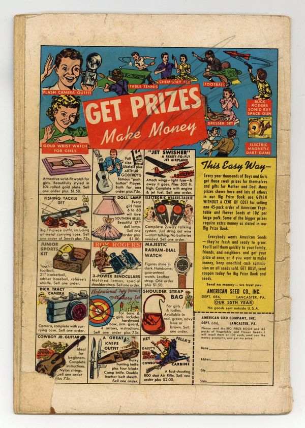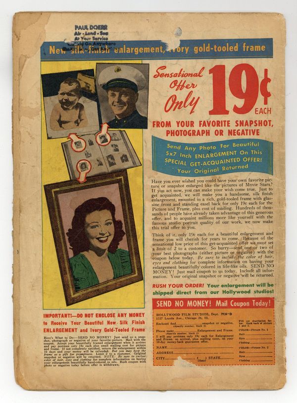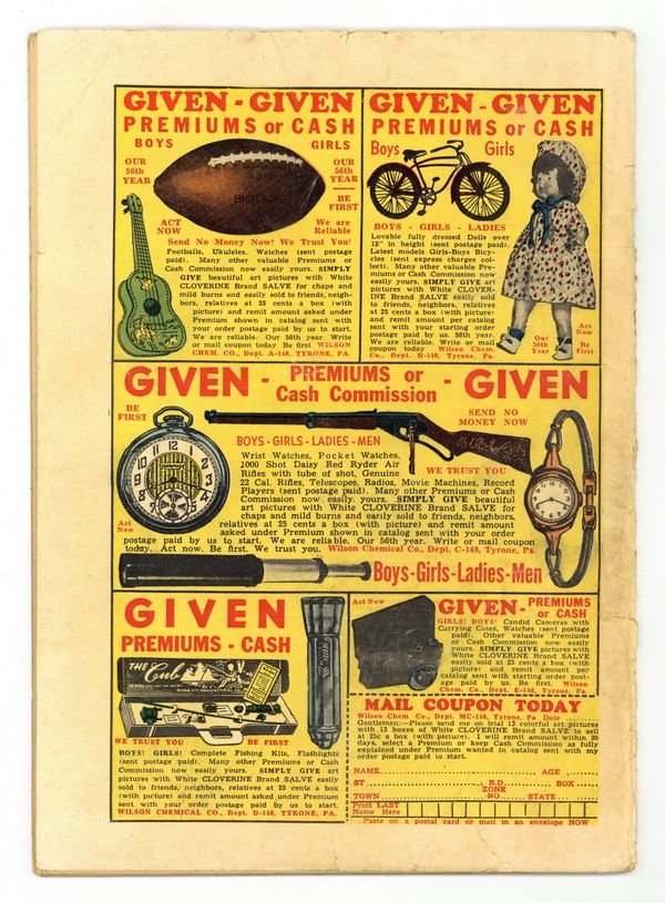 Published Mar 1941 by Dell/Gold Key.$135.00- INCOMPLETE. Missing pieces in first half of book affecting art and story (visible in scan). Full length spine split. Staples added (not manufacturing). Centerfold detached at original center staple. Cover oxidation with chipping. Water damage.