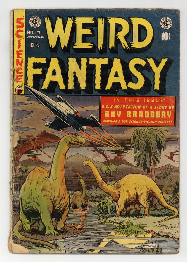 This key and very classic EC issue begins with an Al Feldstein dinosaurs and space cover. "In the Beginning" (art by Joe Orlando), "Ahead of the Game" (art by Bill Elder), "The Aliens" (art by Al Williamson with Roy Krenkel), the classic story that features a single full infinity page in which two aliens gaze at a page the repeats itself into infinity and say "Squa Tront!" and "Spa Fon" (and we ALL know what that means!), and Ray Bradbury's haunting "There Will Come Soft Rains" (art by Wally Wood). NOTE: See 1st Series for 1951 #17. Cover price $0.10.