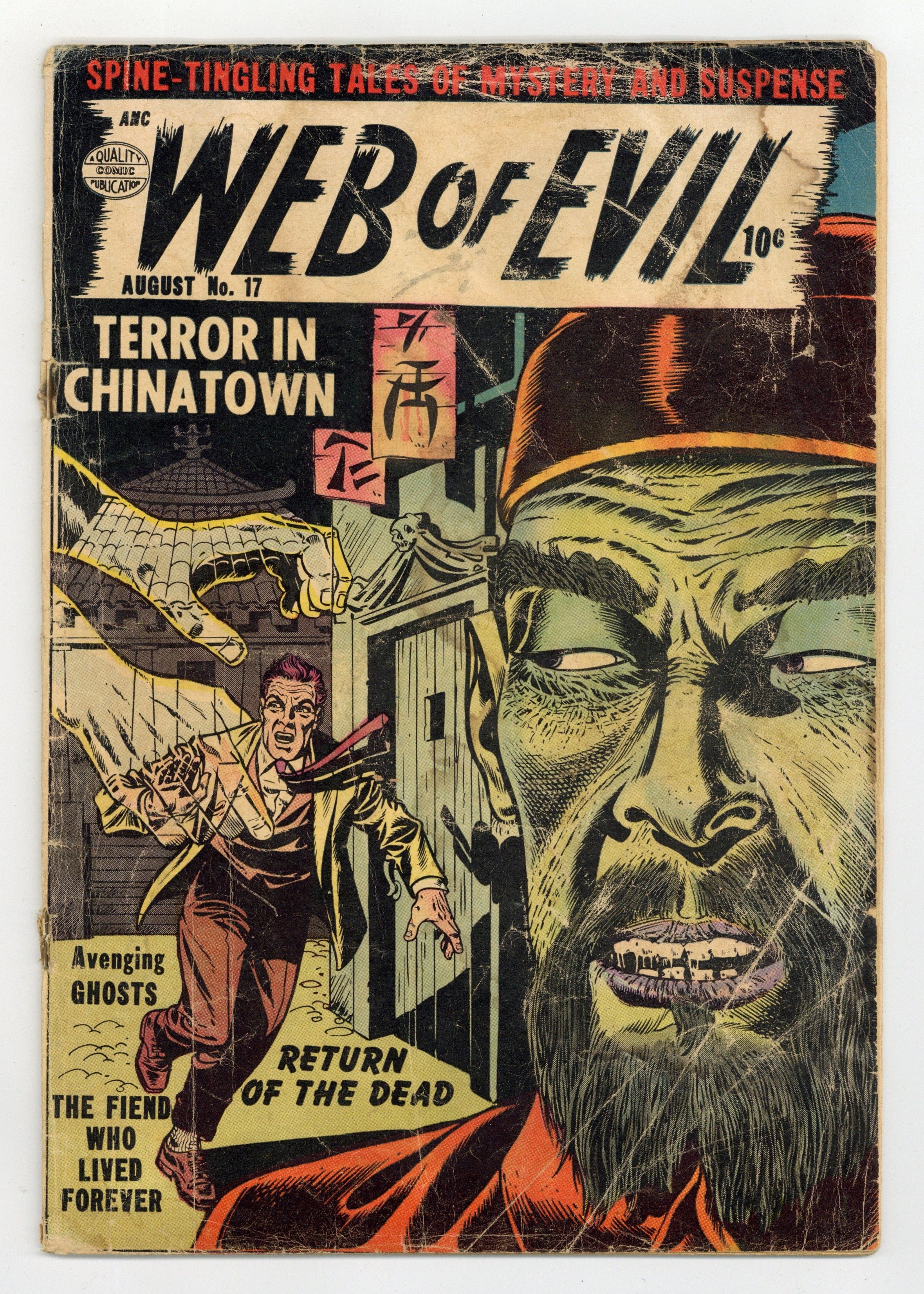 "Return of the Dead," pencils by Charles Nicholas; Serge Lamont builds a machine to communicate with the dead; He uses it to learn all the magic secrets of the recently deceased magician Zendali. "The Fiend Who Lived Forever," art by Louis Ravielli; A scientist is able to make himself immortal through experimentation on human victims; He robs banks to gather enough wealth to marry his sweetheart. "Terror in Chinatown," pencils by Charles Nicholas; The collector August Lamont searches frantically for a Chinese "book of the dead" holding great secrets; Lamont murders two book dealers to get his hands on the tome. "Death's Challenge" text story. "The Avenging Ghosts," pencils by Charles Nicholas; Gangsters Pete and Joey escape from their prison island in a motorboat and land on the "island of honesty" where no crime ever happens. 36 pgs., full color. $0.10. Cover price $0.10.