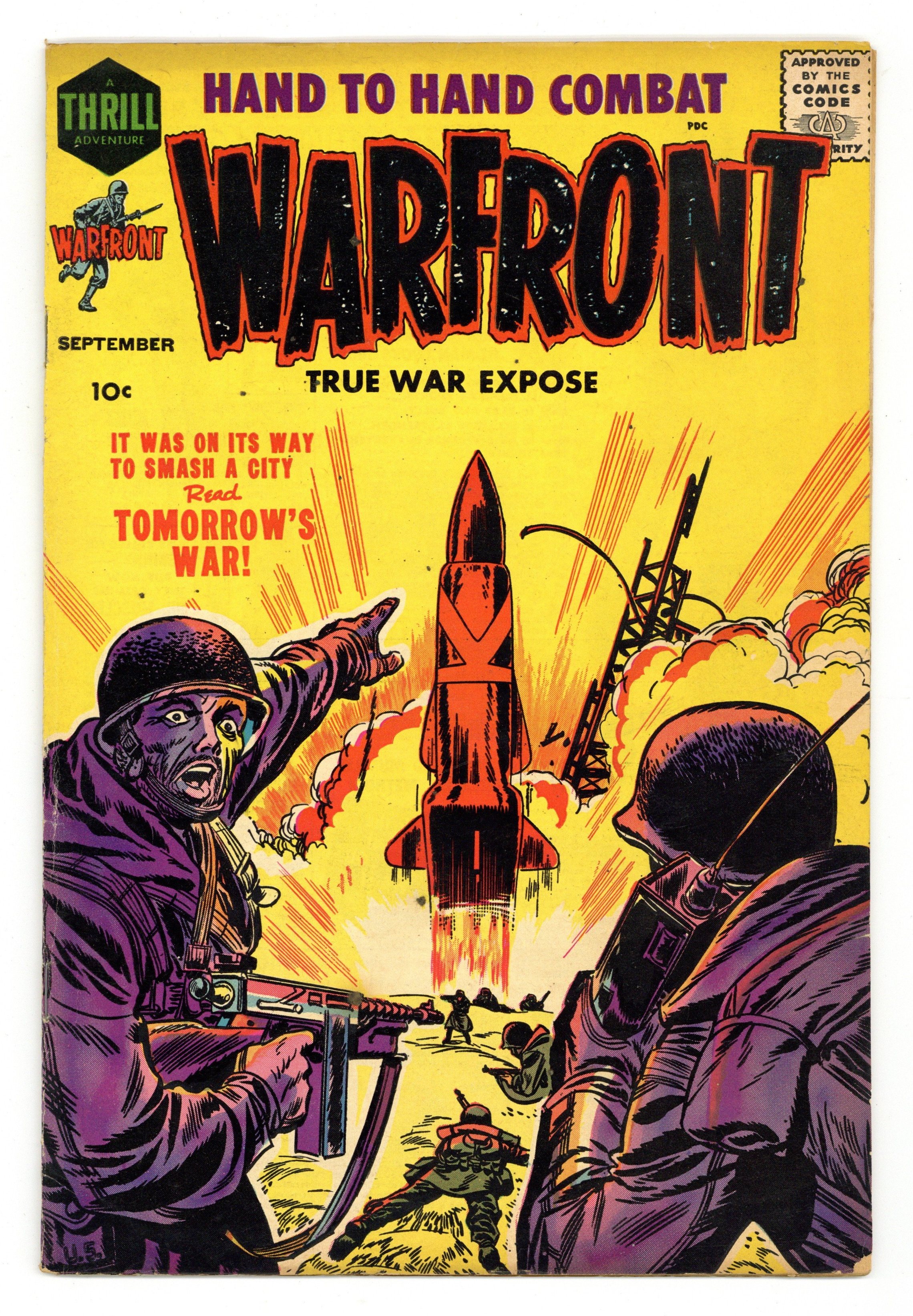 "Reds All 'Round Us" (art by Gene Colan?), "Assault By Night" (art by Cal Massey), "Riot," "Surrender at Dawn" (art by Reed Crandall), "Platoon Leader" (art by Joe Sinnott), and a two-page text story, "One-Man Weapon." Cover price $0.10.