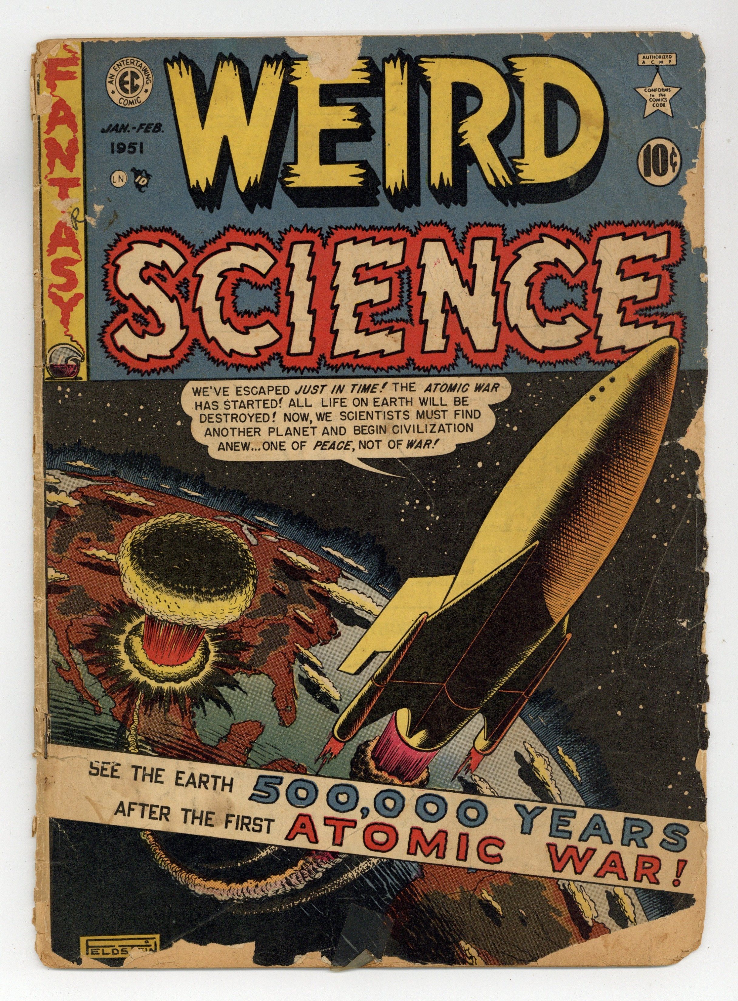 Cover by Al Feldstein. Stories by Harvey Kurtzman, Bill Gaines and Al Feldstein. Art by Harvey Kurtzman, Jack Kamen, Wally Wood, and Al Feldstein. EC's influential New Trend title featured some legendary sci-fi and comics artists. Scientists wonder if a threat from another world would unite humanity's warring factions, then get the chance to find out, in a story by Harvey Kurtzman. Space travelers visit their war-ravaged homeworld to find nothing's changed, with art by Wally Wood. A time-travel murder mystery is so convoluted it needs its own explanatory diagram, which is included. Classic Al Feldstein atom bomb/space cover. Made of the Future!; Return; Progress; The Last War on Earth; The Man Who Was Killed in Time. 36 pages, Full Color. Cover price $0.10.