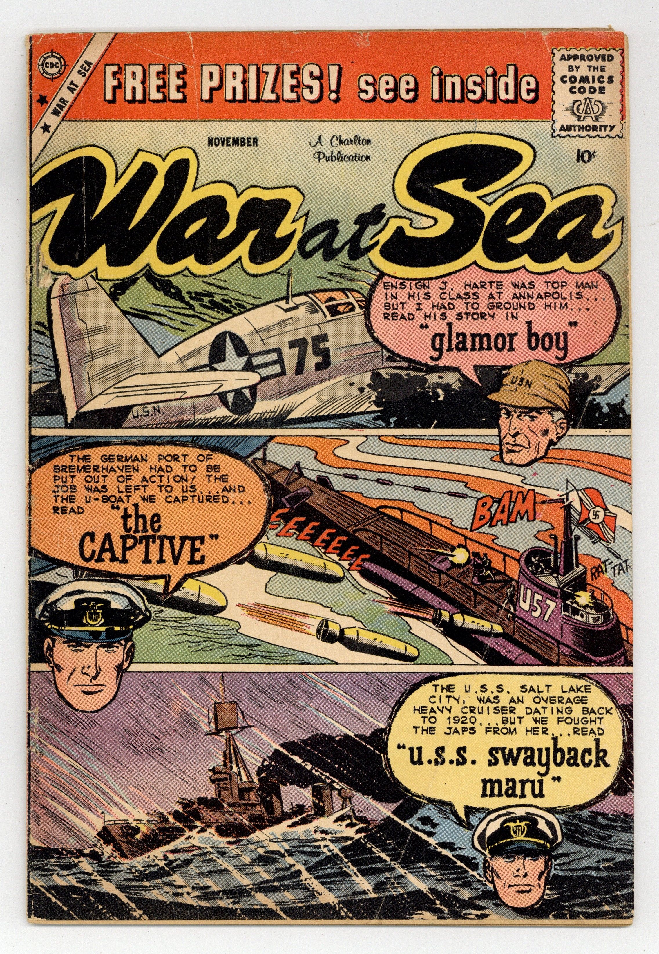Cover by Bill Molno. Stories and art by Bill Molno, Vince Alascia, Sal Trapani, and Rocco "Rocke" Mastroserio. Tales of combat on the open sea during WWII. Ensign Harte is top of his class at Annapolis, but his fame and ego outgrow his accomplishments. Allied sailors capture a U-boat and target the German port of Bremerhaven. An ancient cruiser from the 1920s is called back into action against the Nazi menace. U.S.S. Swayback Maru; The Captive; Breakdown; The Helmet; Order of Olives; Glamor Boy. 32 pages, Full Color. Cover price $0.10.