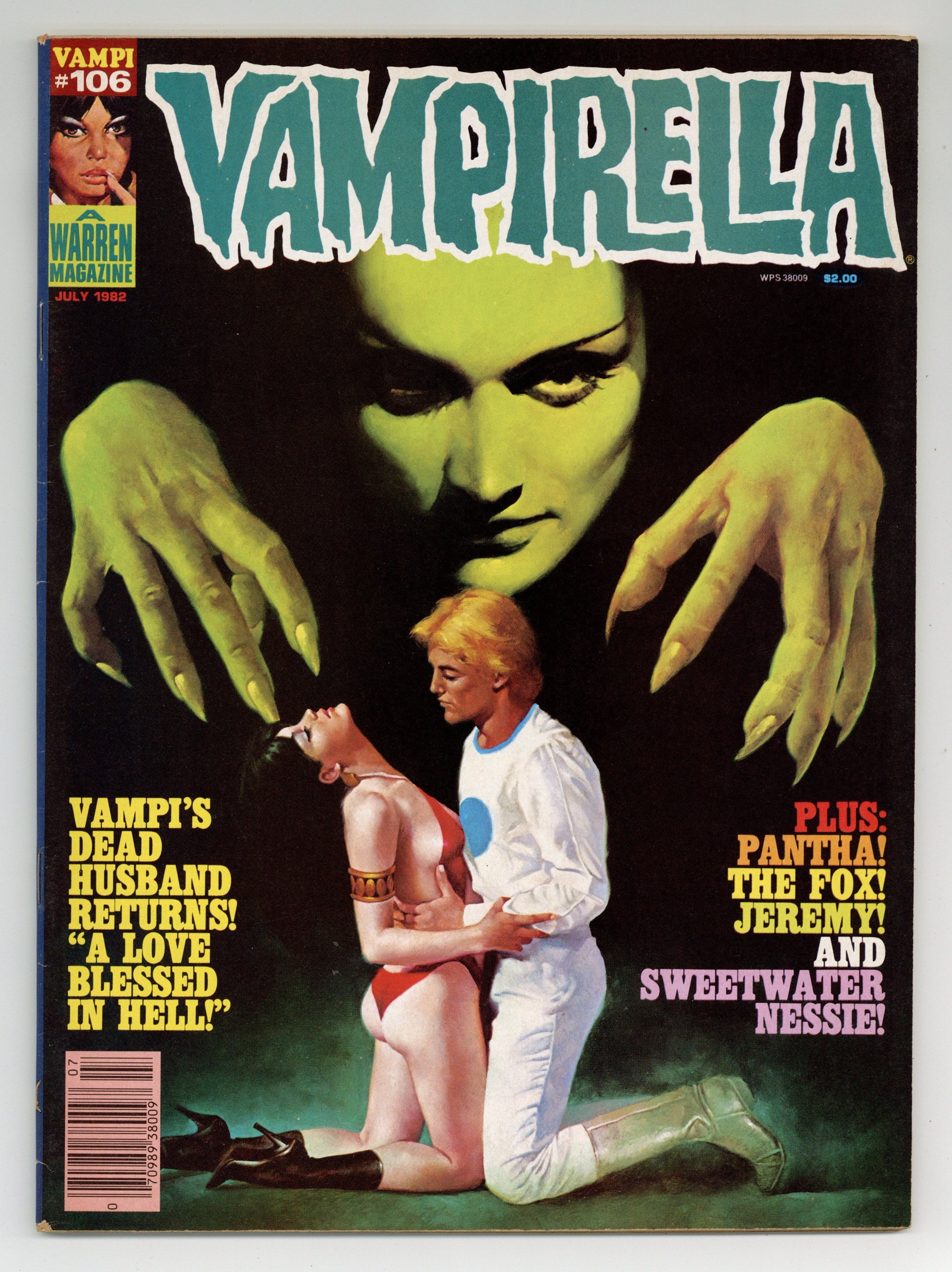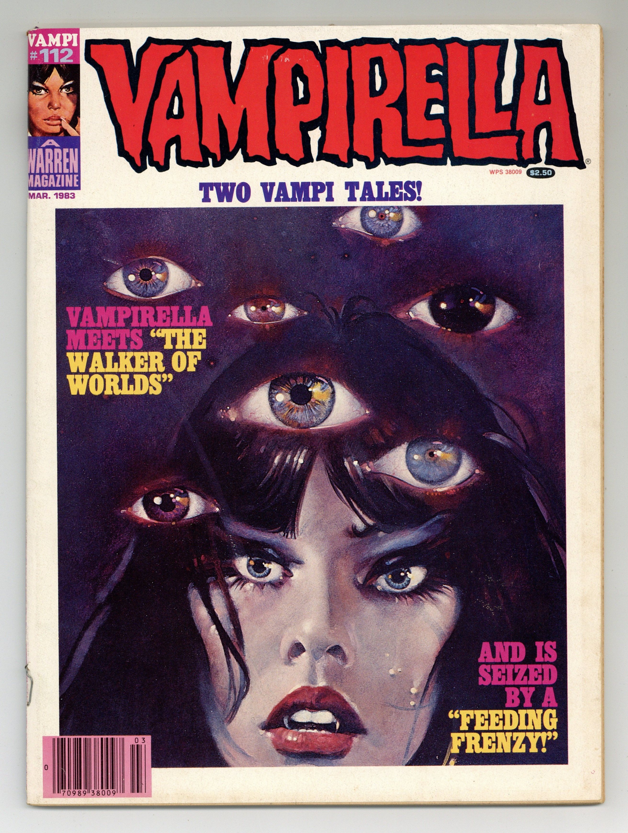 This last Warren issue of Vampirella (Harris would go on to publish #113) includes the following stories: "Vampirella: The Walker of Worlds"; "The Fox: Shadows of the Mind"; "Torpedo, 1936: Frankie"; "The Ransom"; "Limbo"; and "Vampirella & Pantha: Feeding Frenzy." Written by Rich Margopoulos, John Ellis Sech, Sanchez Abuli, Michael Fleischer, and Bill DuBay. Art by Jose Gonzalez, Luis Bermejo, Sanchez Abuli, Auraleon, Esteban Maroto, and Gonzalo Mayo. Cover art by Martin Hoffman. Cover price $2.50.