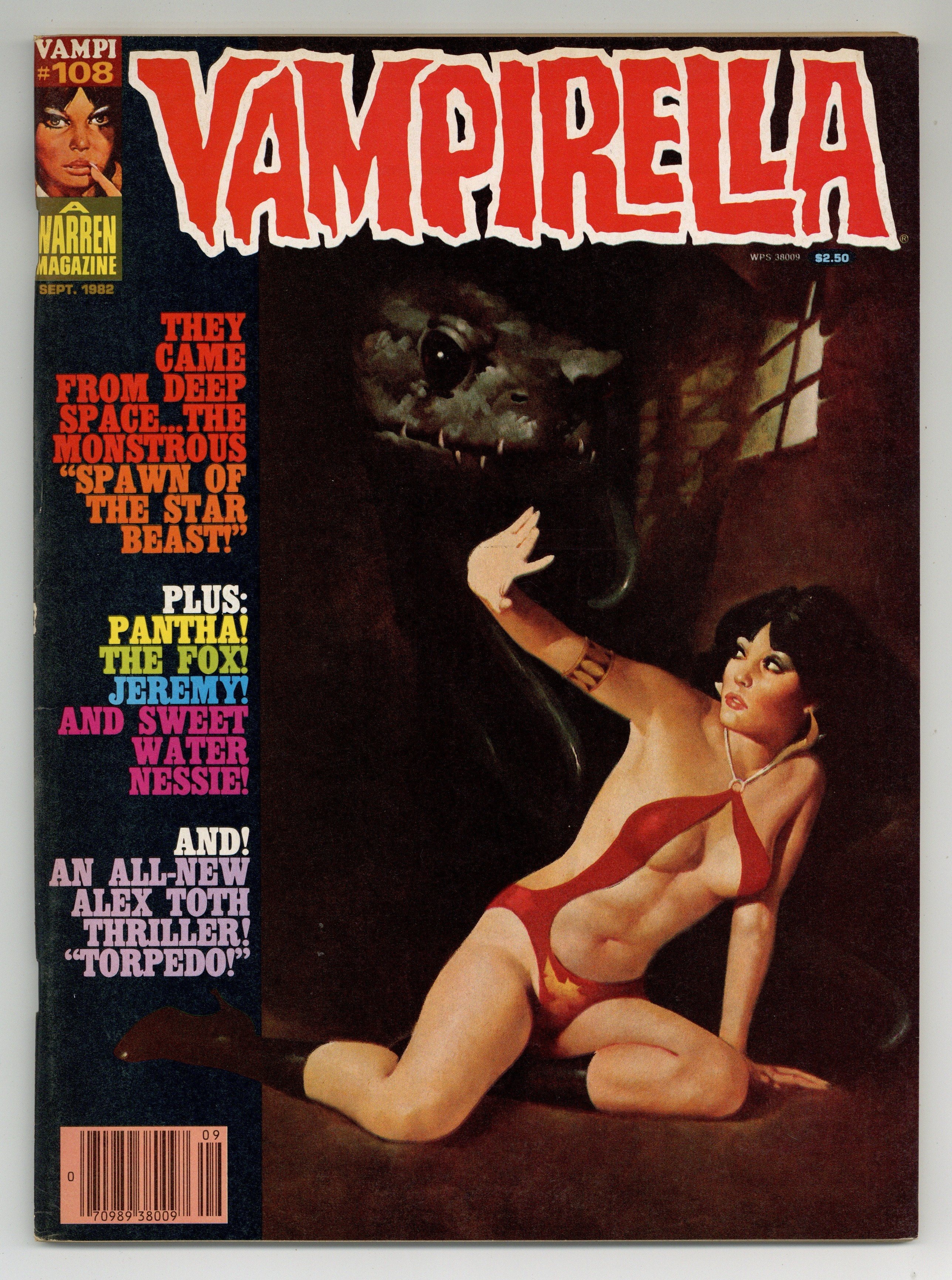 Stories in this issue include: "Vampirella: Spawn of the Star Beast"; "Sweetwater Nessie" part two; "Pantha: Circus Monstrous"; "The Fox: The Beast Lies Sleeping"; "Jeremy" part three; and "Torpedo, 1936." Written by Rich Margopoulos, Don McGregor, David Allikas, Nicola Cuti, Paul Gillon, and Sanchez Abuli. Art by Jose Gonzalez, Auraleon, Jose Ortiz, Luis Bermejo, Paul Gillon, and Alex Toth. Includes 1981 Warren Awards. Cover art by Enrich Torres. Cover price $2.50.