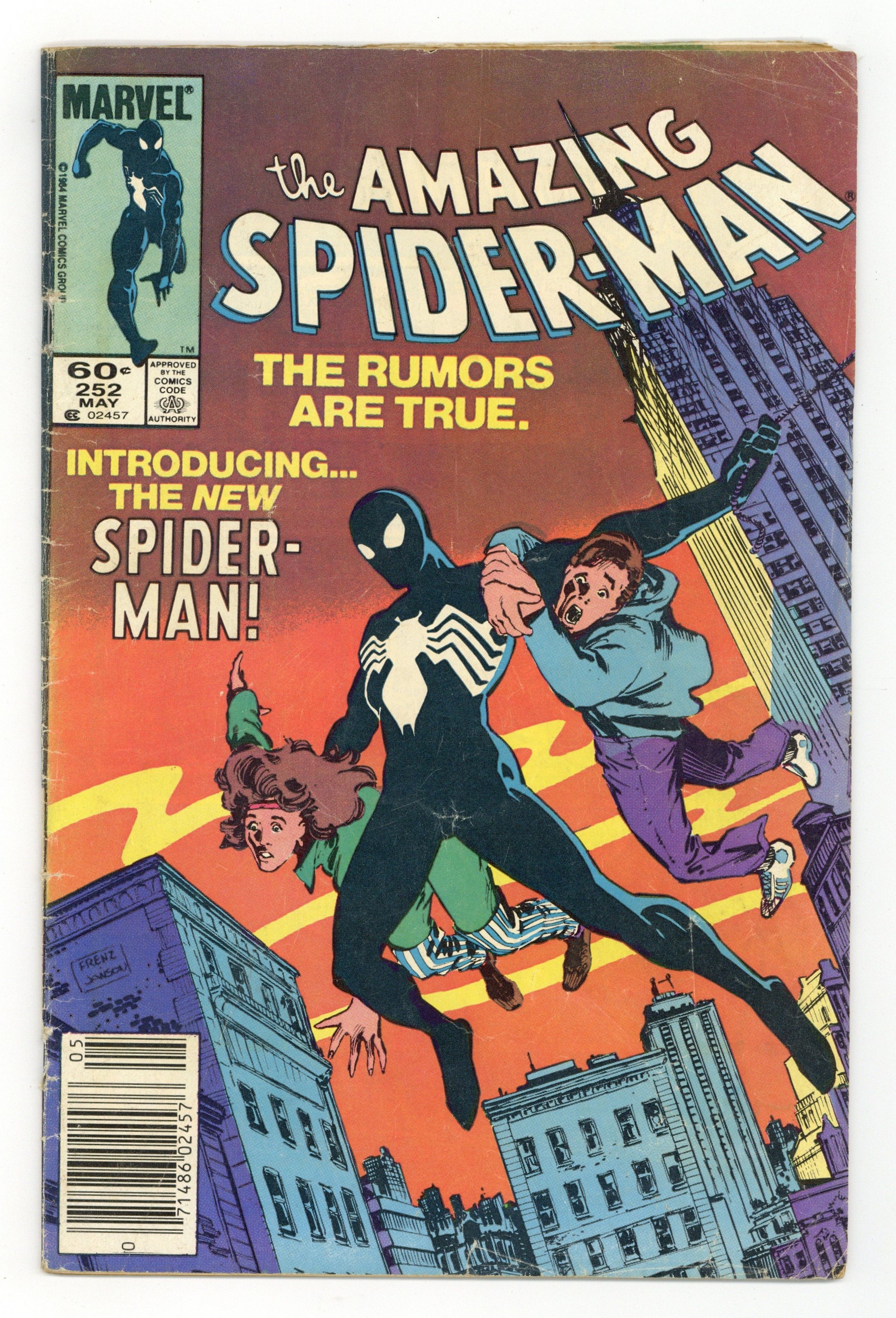 Newsstand Edition. First appearance of Spider-Man's new black (alien symbiote) costume in "Homecoming!" Plot by Roger Stern. Script by Tom DeFalco. Pencils by Ron Frenz (breakdowns) and Brett Breeding (finishes). Cover by Ron Frenz and Klaus Janson. One of the landmark issues of the Amazing Spider-Man! With a brilliant flash of light in Central Park, the wondrous wall-crawler is back! And he looks a whole lot different! Wow, a new costume! What happened during the Secret Wars on the Beyonder's world? The ominous truth will be revealed to both the readers and the web-slinger in the days and weeks ahead! Cameo appearances by the Black Cat, Dr. Curt Connors, J. Jonah Jameson, Joe Robertson , Aunt May, Captain America, Captain Marvel, Hawkeye, Iron Man, Thor, and the Wasp. (Notes: Marvel Age 12 contained sketches of the new costume two months prior to the publication of this issue. Spidey's new costume was also unveiled in Marvel Team-Up 141 and Spectacular Spider-Man 90. The first issue of the (1984) Marvel Super Heroes Secret Wars Limited Series was published the same month as Amazing Spider-Man 252. The web-slinger discovers his new costume in issue 8 of the limited series. The Frenz-Janson cover is a tribute to the iconic cover of Amazing Fantasy 15. This story was reprinted in Marvel Tales 266. The letters page contains a statement of ownership: average print run 470,527; average paid circulation: 241,762. 36 pgs. Cover price $0.60.