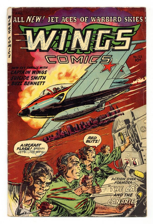 Cover by Maurice Whitman. Edited by J.F. Byrne and Jerry Iger. Stories and art by John Belcastro, A. Albert, Maurice Whitman, Art Peddy, Bernard Sachs and Bill Discount. Aviation-themed adventure, combat and history tales from pioneering comics publisher Fiction House. Captain Wings and his pilot trainees must take on an elite enemy squadron before they're ready; A disgraced airman struggles to prove himself; Buzz Bennett runs out of gas on a reconnaissance mission, just as he spots an enemy carrier. Captain Wings; Delayed Action; Buzz Bennett; When Knights Were Bold!; Suicide Smith. 32 pages, Full Color. Cover price $0.10.