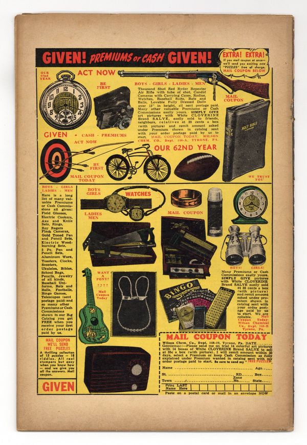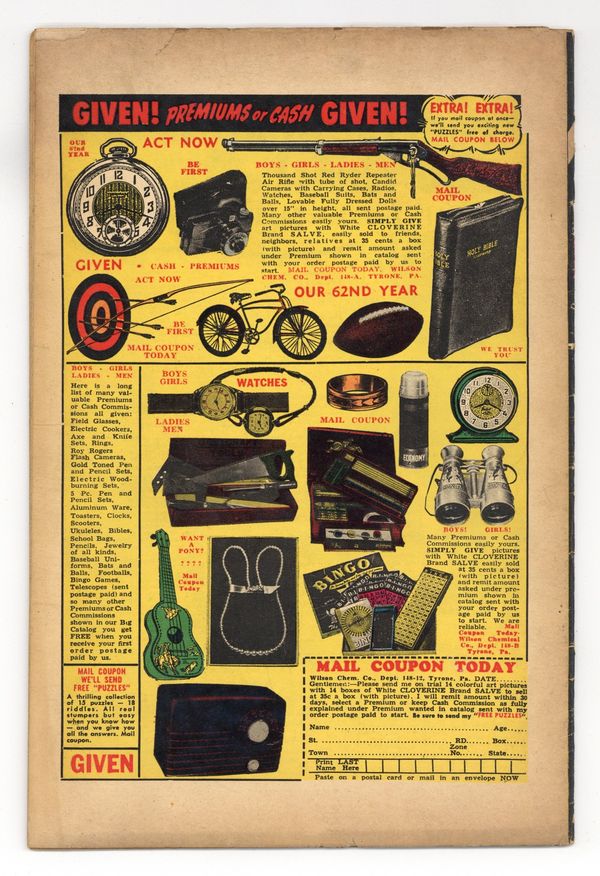 Cover pencils by Curt Swan, inks by Stan Kaye. The Dictator of Krypton City, script by Bill Finger, pencils by Dick Sprang, inks by Stan Kaye; Luthor shrinks himself and tricks Superman into leaving him in the Fortress, where he enters Krypton City [Kandor] and takes over. Mystery of the Vanishing Boys starring Tomahawk, art by Bob Brown. Case of the Green Error Clown starring Green Arrow, art by Lee Elias; Green Arrow and Speedy meet the Green Error, a clown who spoofs Green Arrow at the circus. Green Error's tools help them stop the robbers who stole the day's receipts. 36 Pages, Full Color. Cover price $0.10.