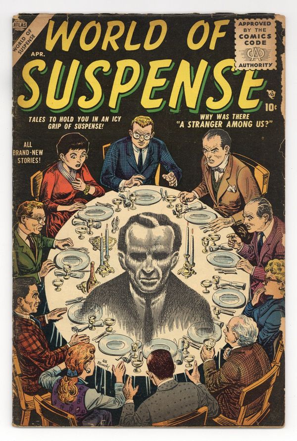 Cover art by Joe Maneely. A Stranger Among Us, art by Bill Everett; Two men in a lab are told a story by a man behind a glass window about visiting a world of giants. The Two-Faced Man, art by Joe Maneely; A stagehand of the play Cyrano De Bergerac is in love with the leading lady so he resolves to knock out the leading man and don his makeup so he can get close enough to her to confess his feelings. Bright New World!, art by Al Hartley. The Alchemist's Apprentice, art by Syd Shores. The Art Expert text story. What Happened In The Cave?, art by Mort Drucker. The Mechanical Man!, art by Chuck Miller. 36 pgs. $0.10. Cover price $0.10.
