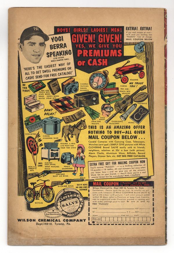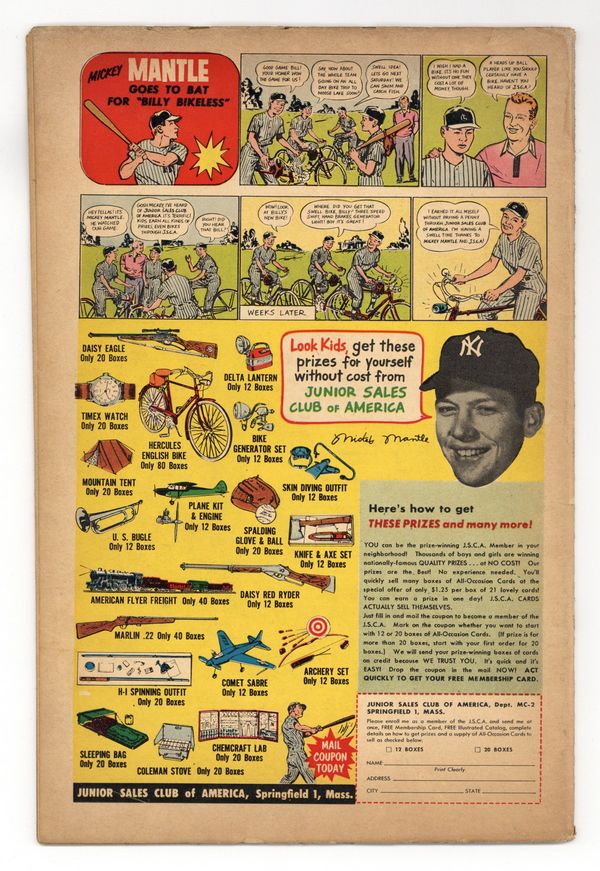 Cover pencils by Curt Swan, inks by Stan Kaye. The Day Superman Betrayed Batman, script by Bill Finger, pencils by Dick Sprang, inks by Stan Kaye; The Condor Gang frames Batman for taking a bribe to let a criminal escape. Superman is forced to arrest Batman and Robin and then spends his time trying to prove their innocence, giving the Condor Gang a chance to start a crime spree. Lost: A Free Education public service announcement starring Binky, script by Jack Schiff, art by Bob Oksner. The Strange Journal of Old Blue Jay starring Tomahawk, script by Dave Wood, art by Fred Ray. Ollie humor page by Henry Boltinoff. Menace of the Mechanical Octopus starring Green Arrow, script by Ed Herron, pencils by Jack Kirby, inks b Jack Kirby and Roz Kirby (backgrounds); Crooks are using a mechanical octopus to commit robberies. 36 Pages, Full Color. Cover price $0.10.