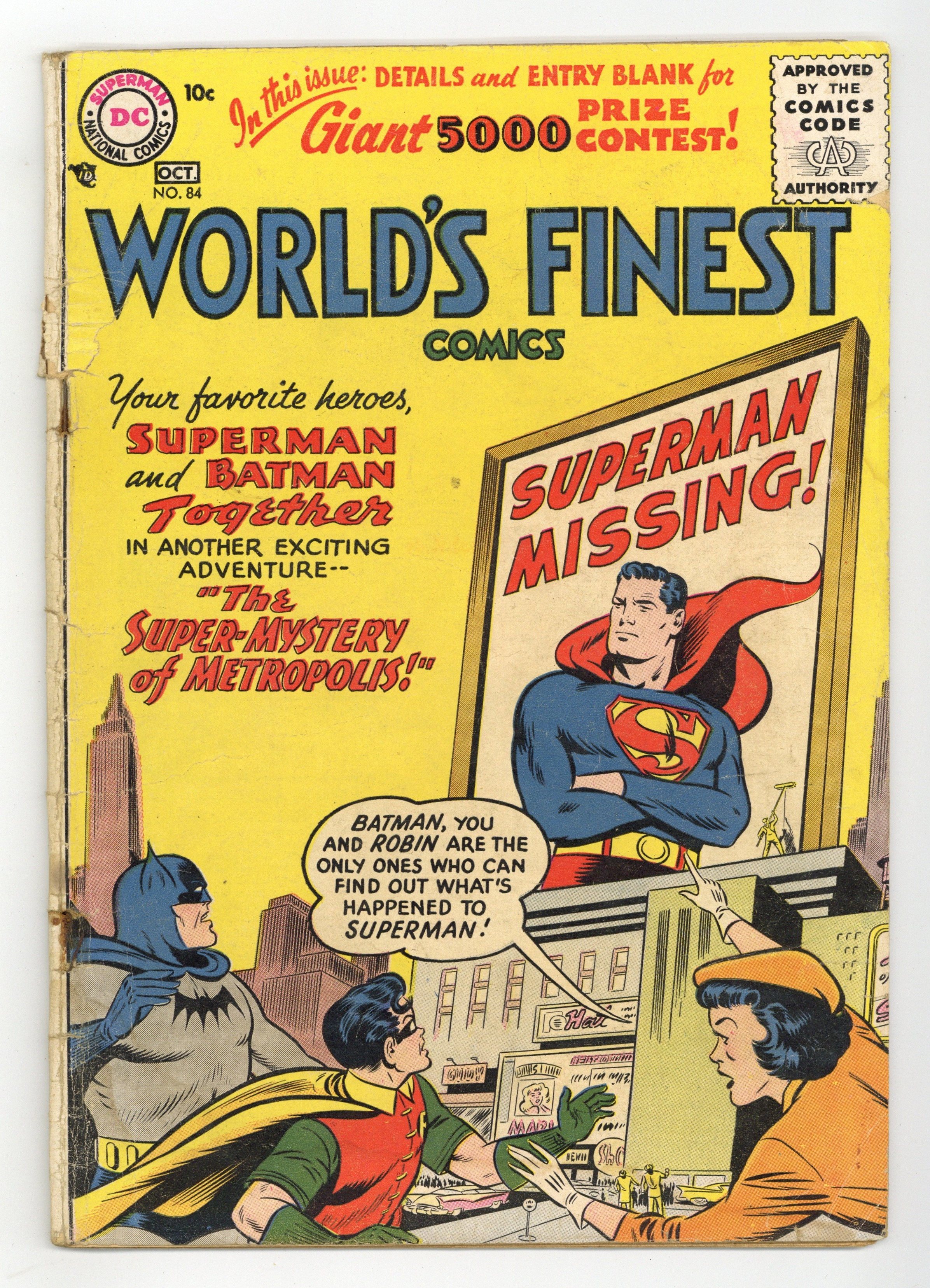 Cover pencils by Dick Sprang, inks by Stan Kaye. The Super-Mystery of Metropolis!, script by Edmond Hamilton, pencils by Curt Swan (splash) and Dick Sprang, inks by Stan Kaye; Superman believes that Thad Linnis knows his secret identity, so when Thad demands he leave Metropolis, Superman does; Superman reveals to Batman and Robin a tale of his youth in Smallville, and discovers that the young boy that he thinks may have discovered his identity was actually a young Bruce Wayne. The Mystery of 1,000 Masks starring Green Arrow, script by Dave Wood, art by George Papp. The Big Dance! public service announcement, script by Jack Schiff. The Frontier Braggart starring Tomahawk, script by Dave Wood, art by Bob Brown. 36 Pages, Full Color. Cover price $0.10.