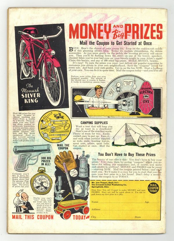 Painted cover art by Allen Anderson. Ad for Jim Prentice Electric Football. Victory on Valda, art by Murphy Anderson; Captain Crockett's troops have a hard time convincing the freedom fighters of the planetoid Valda that they're not just as bad as the Belzarians, until nurse Wing saves Menso's daughter Rada. Every Space Buster a One-Man Army; Everything you want to know about their metallo-plastic helmets, thermo rifle, proton pistol, micro-grenades, and Space Buster Academy outside Luna City on the Moon. Remember Makano, art by Murphy Anderson; After the traitor Senstral leads an attack of the Utani ape-men on the outpost on Makano, Captain Crockett leads a select platoon that decimates the Utani barracks and destroys the Belzarian death ray tank corps. The True Story of Flying Saucers text story by Harry Harrison. Life in the Solar System, art by Everett Raymond Kinstler; Mercury is too hot, Jupiter is too cold, but they hold out the possibility of life on Venus and Mars. Mission to Baldor!, art by Marvin Stein; Capt. Crockett befriends Sabra, the leader of the guerilla movement on the planetoid Baldor. The Batmen of Luna, art by John Prentice. 36 pgs. $0.10. Cover price $0.10.