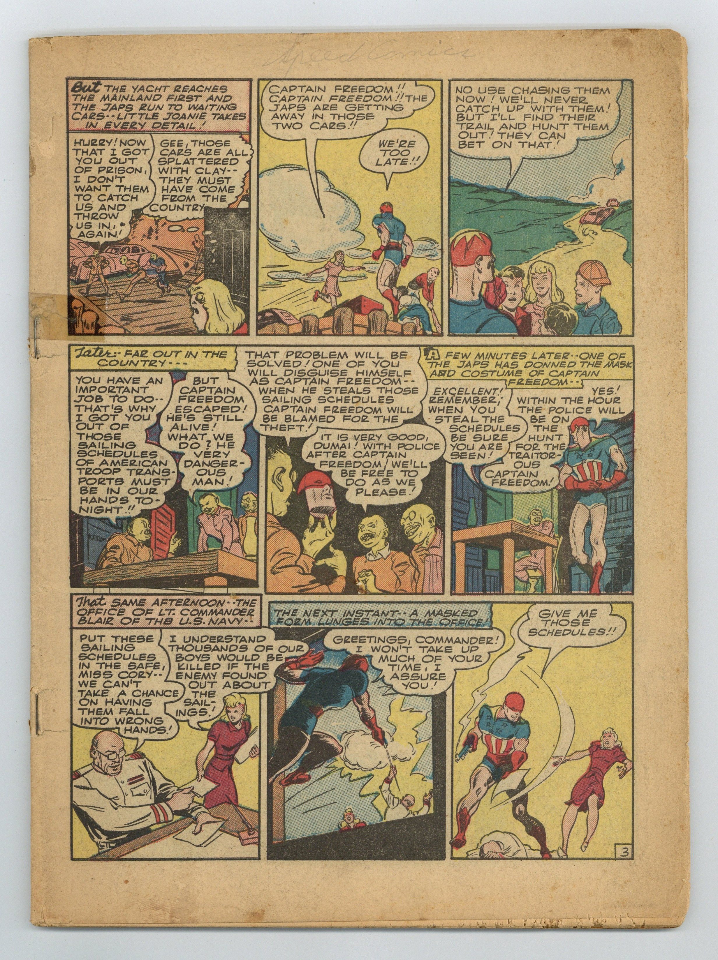 Cover art by Alex Schomburg. Captain Freedom story. The Canister of Death starring Black Cat. The Maharajah's Major-Domo starring the Girl Commandoes, art by Jill Elgin. Speed Sticklers activity page by A. W. Nugent. Biff Bannon story, script and art by Art Helfant. The Battle of the Bats starring Shock Gibson. The Story Behind the Cover text article with Hitler and Tojo. Padlock Homes story, script and art by Ed Wheelan. Flossie filler page by Jourdain. Flying Stripes of Courage, pencils by Martin Epp. 60 pages, four color. Cover price $0.10.