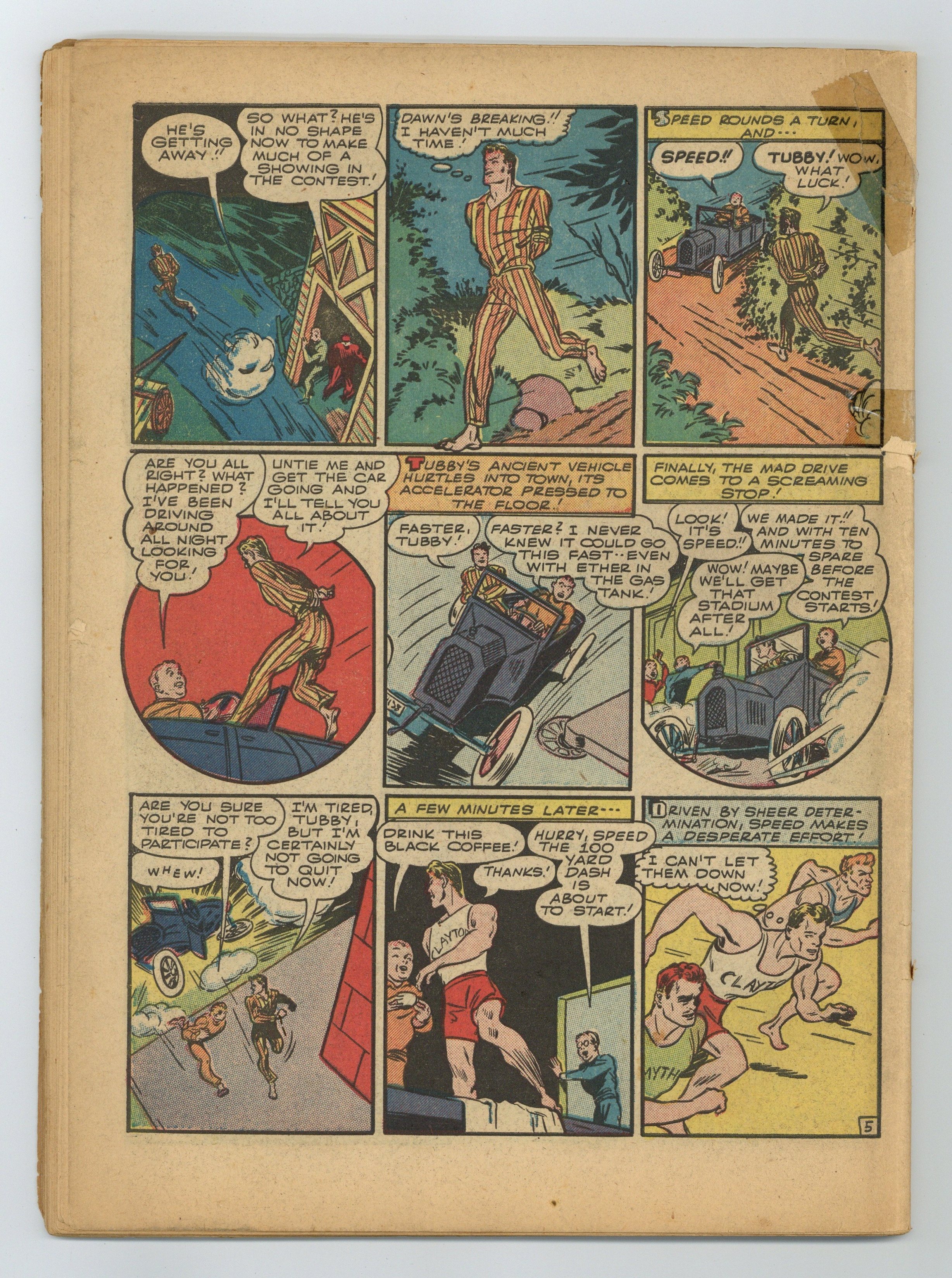 Cover art by Maurice Scott. Shock Gibson story, art by Maurice Scott. Crash, Cork, and the Baron story, script and art by Klaus Nordling (Fred North). Ted Parrish story, script and art by Bob Powell. Catching a Crook text story. Biff Bannon story, script and art by Dick Briefer (Rem Brant). Death Races the Fire Fiend starring Smoke Carter, script and art by Munson Paddock (Joe E. Martin). Landor, Maker of Monsters story, art by Gregory Torey. Liquid Gold On the Chase Ranch starring Texas Tyler, script and art by Harry Walters. Spike Marlin story, art by George Tuska (Carl Larson). 68 pages, full color. Cover price $0.10.