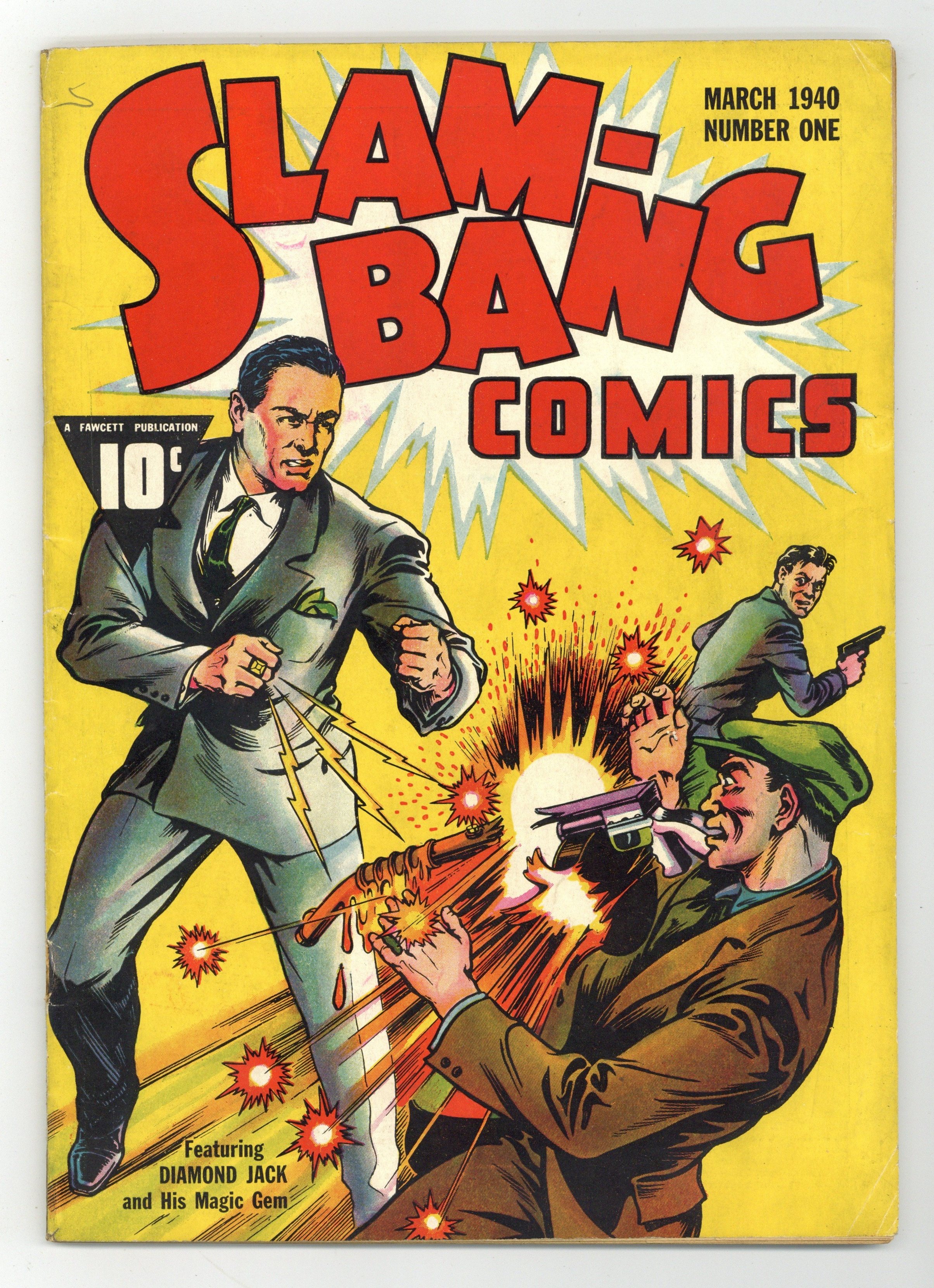Stories and art by Jack Cole, Gus Ricca, Hal Sharp, and Mike Suchorsky. An adventure anthology from Fawcett, featuring such little-known heroes as Jungle King, Hurricane Hansen, and time traveler Mark Swift. Lee Granger becomes a Tarzan-like figure with a twist: his sidekick is a talking lion named Eric. American seaman Hurricane Hansen joins the British Navy just as war with the Kazilians breaks out. Mark Swift encounters Rodney, a man with a "time retarder," and before he knows it, he's meeting Vikings and Native American chieftains. Plus a gag page by Plastic Man creator Jack Cole. Diamond Jack; Slam-Bang Gags; War Bird; Jim Dolan; Tree-Top Murder; Lucky Lawton; Lee Granger, Jungle King; Hurricane Hansen; Mark Swift and the Time Retarder. 64 pages, Full Color. Cover price $0.10.