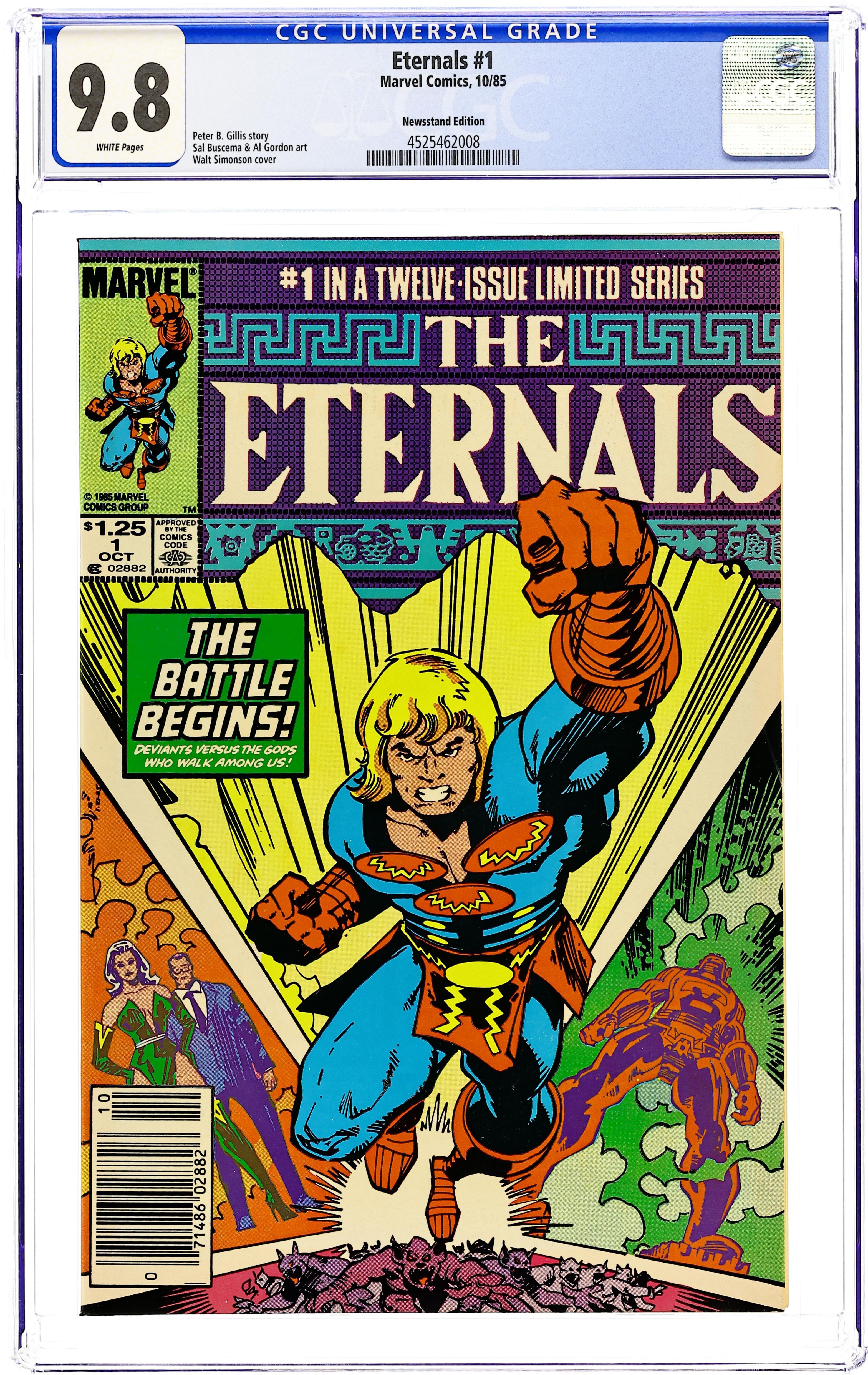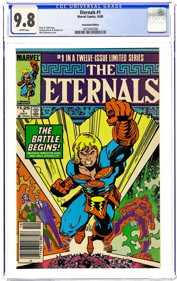 Newsstand Edition. "A Mirror for Mortality!" Written by Peter B. Gillis. Pencils by Sal Buscema. Inks by Al Gordon. Cover by Walt Simonson. Years have passed since the return and judgment of the Celestials. However, only a handful of mortals remember the ordeal with the space gods. One man tries to reveal the truth but no one believes him. Meanwhile, the Eternals, immortal heroes of myth and legend, trying living amongst their mortal cousins and waiting for the return of the Celestials. However, the dark spawn known as the Deviants plot and scheme from the shadows. Can it be long before these demonic monsters strike out against their hated enemies? Includes a 4-page back-up tale which reveals the Eternals influence throughout mankind's history. Note: First appearance of Khoryphos, Cybele, and Phastos. Cover price $1.25.
