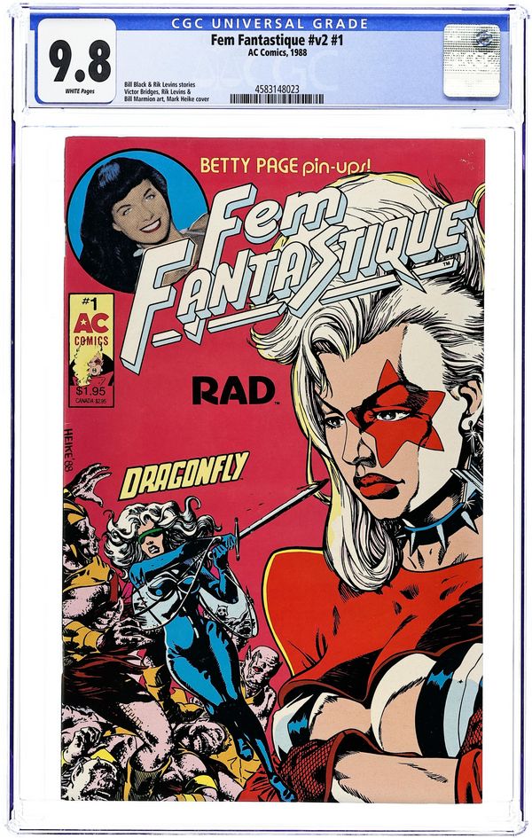 Cover by Mark Heike. Edited by Bill Black. Stories by Rik Levins, Bill Black and Bunny Yeager. Art by Rik Levins, Bill Marmion, John Dell and Vic Bridges. One of the first publications by AC Comics, showcasing the lines early emphasis on Good Girl art. AC revives its 1970s good-girl anthology, this time focusing on solo adventures of its Femforce characters. Rad fights back when aliens want to clone her and create an army; Dragonfly must find a new human host before she vanishes forever. Also, a focus on pinup queens of the past, specifically Betty Page and Sheena star Irish McCalla. Rad; Dragonfly; Spotlight on Betty Page. 32 pages, B&W. Cover price $1.95.