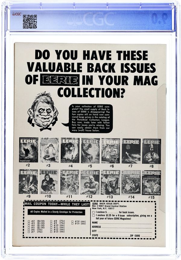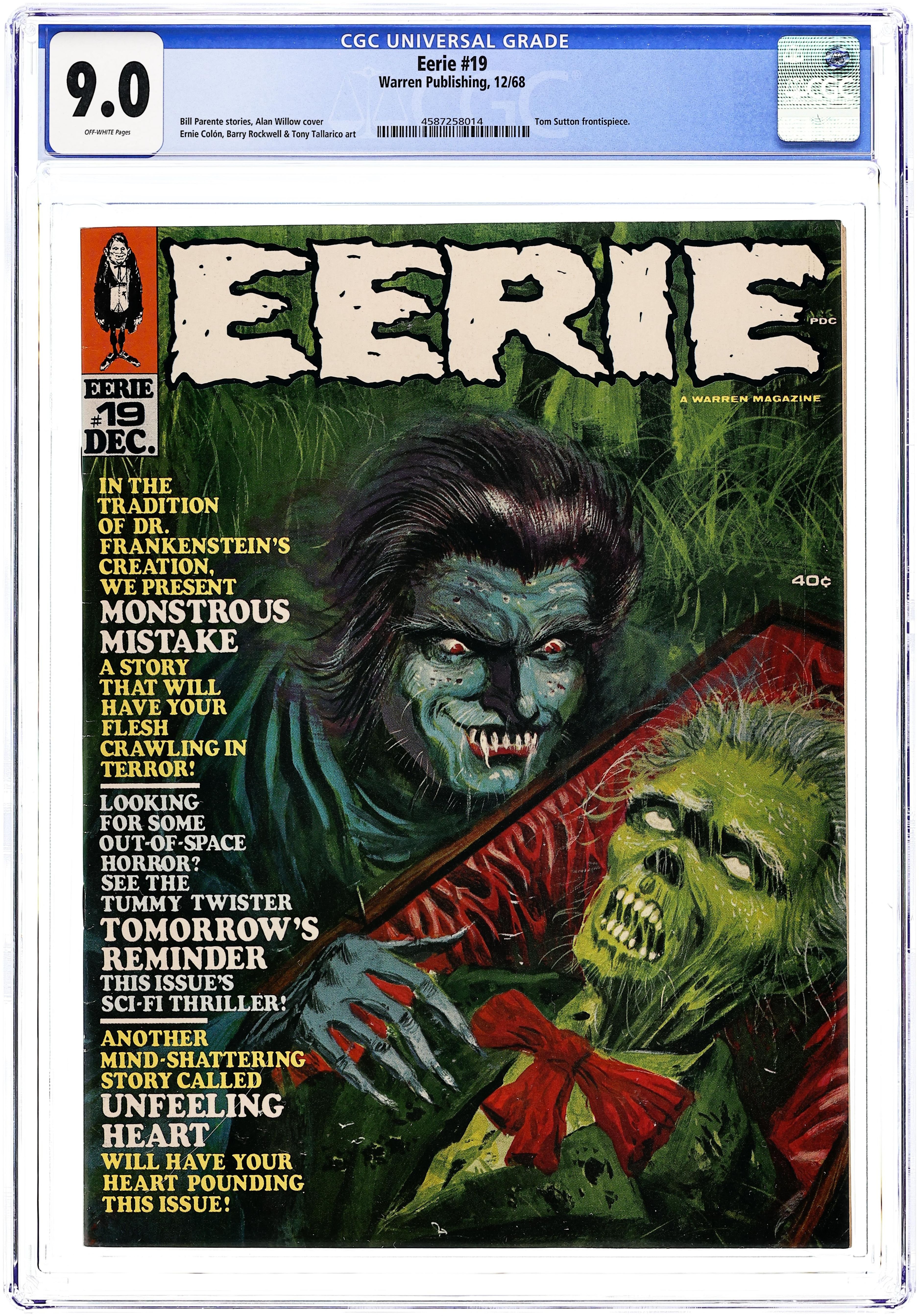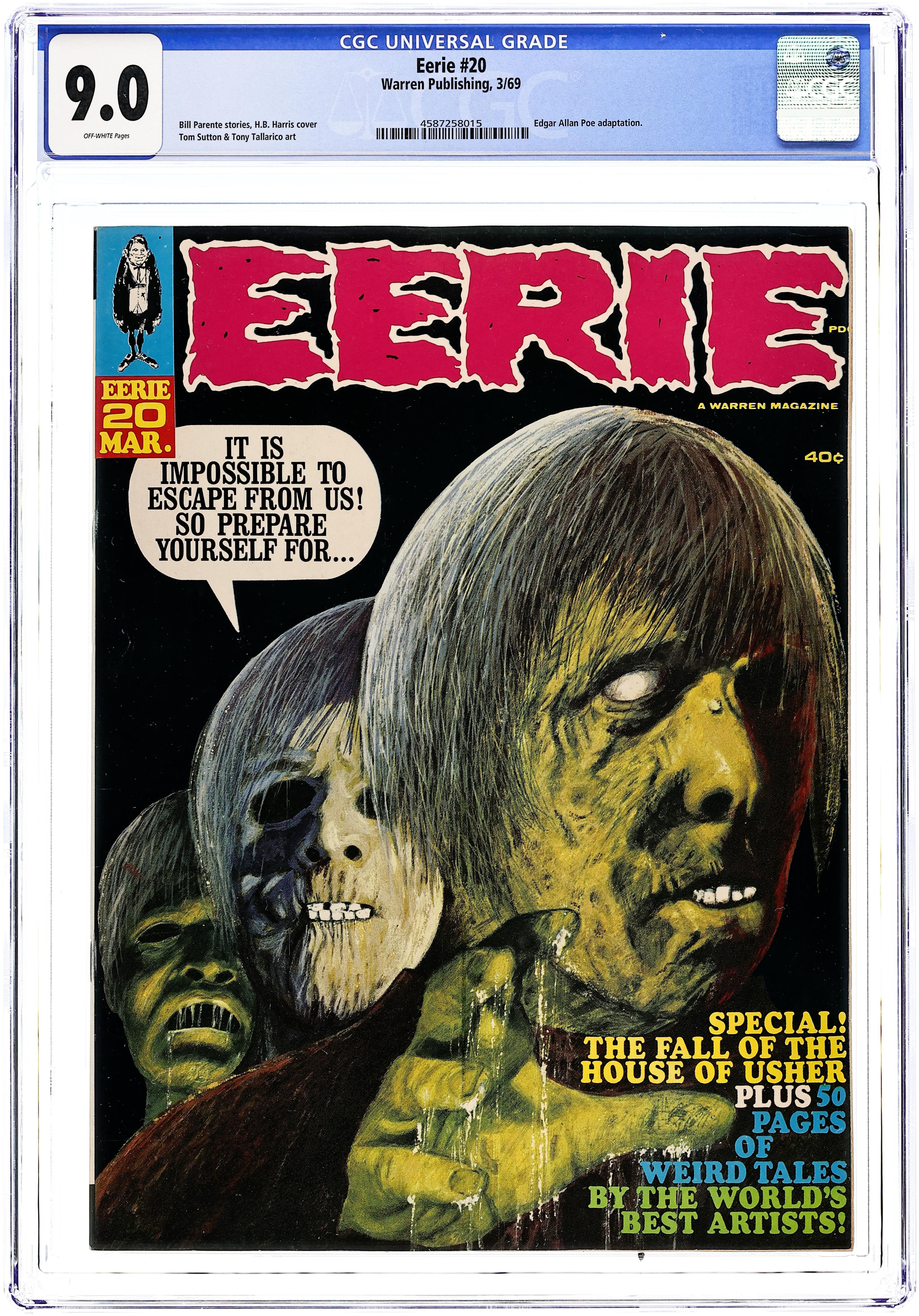 Stories in this issue include: Round Trip by Bill Parente, Bill Fraccio, and Tony Tallarico; A Cloak of Darkness by Bill Parente and Reed Crandall; Cave of the Druids by Archie Goodwin and Reed Crandall; The Fall of the House of Usher by Tom Sutton (from the story by Edgar Allan Poe); and Dark Rider by Archie Goodwin and John Severin. Cover art by H.B. Harris. Cover price $0.40.