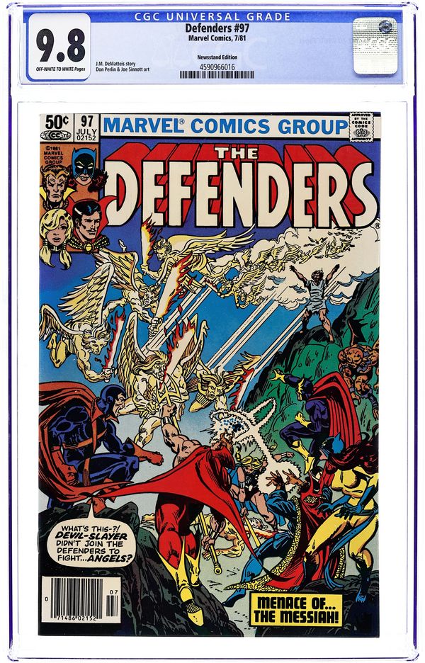 Newsstand Edition. Devil-Slayer laments joining the Defenders if it means he has to fight...angels! It's the menace of the messiah in "Slouching Toward Bethlehem." Written by J.M. DeMatteis, with art by Don Perlin, Joe Sinnott, Sal Trapani and Jack Abel. Cover inks by Al Milgrom. 36 pgs. Cover price $0.50.