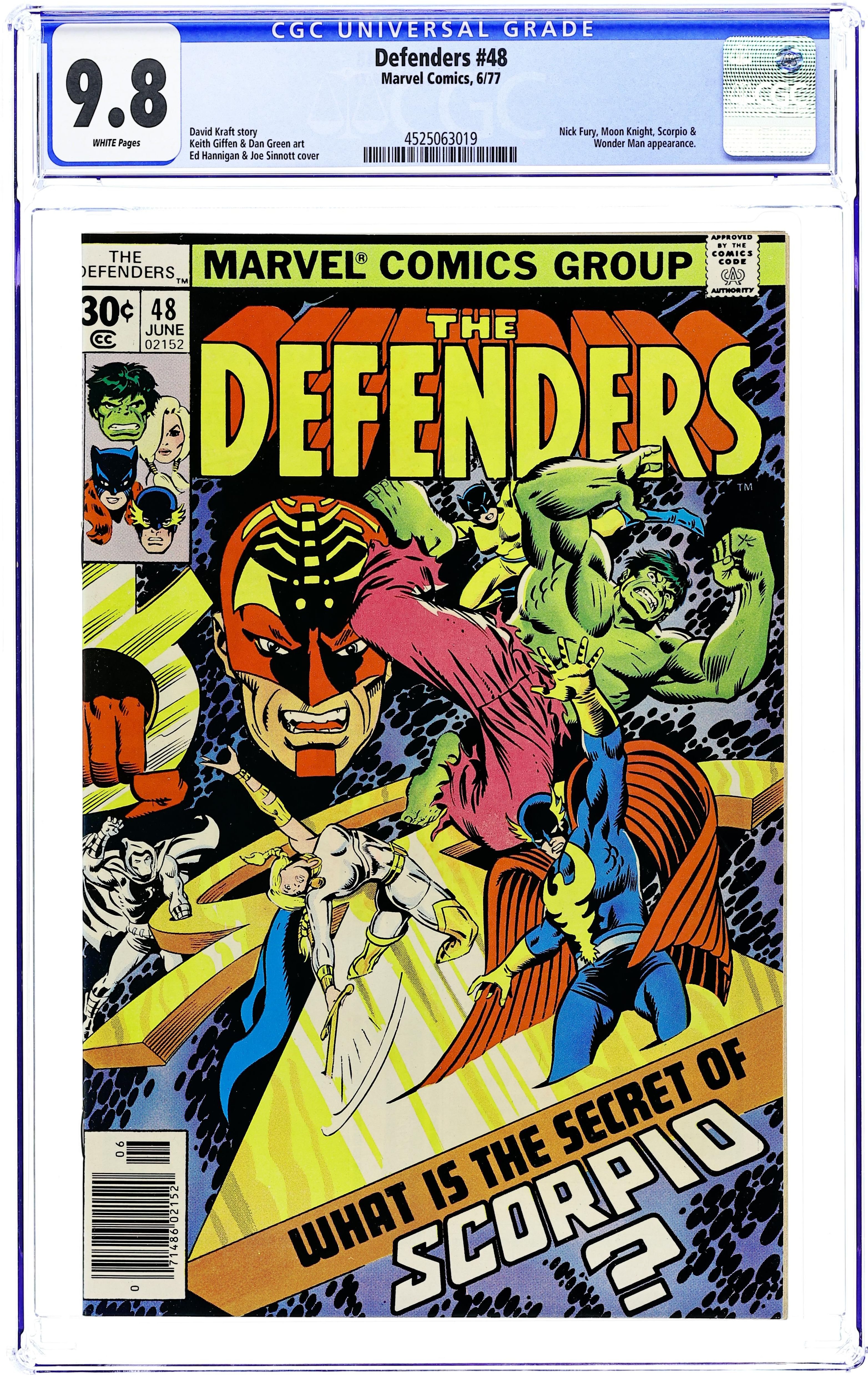 Cover pencils by Ed Hannigan and Marie Severin (alterations), inks by Joe Sinnott and Marie Severin (alterations). Who Remembers Scorpio? Part One Sinister Savior!, script by David Kraft and Don McGregor (script assist), pencils by Keith Giffen (breakdowns) and Dan Green (finished art), inks by Dan Green; Scorpio captures Jack Norriss and asks the Defenders for $500,000 in ransom; The ransom is delivered by Nighthawk, whom Scorpio captures. Captain America stars in a one-page Hostess ad, The Sore Sir's Apprentices. 36 pgs. $0.30. Cover price $0.30.