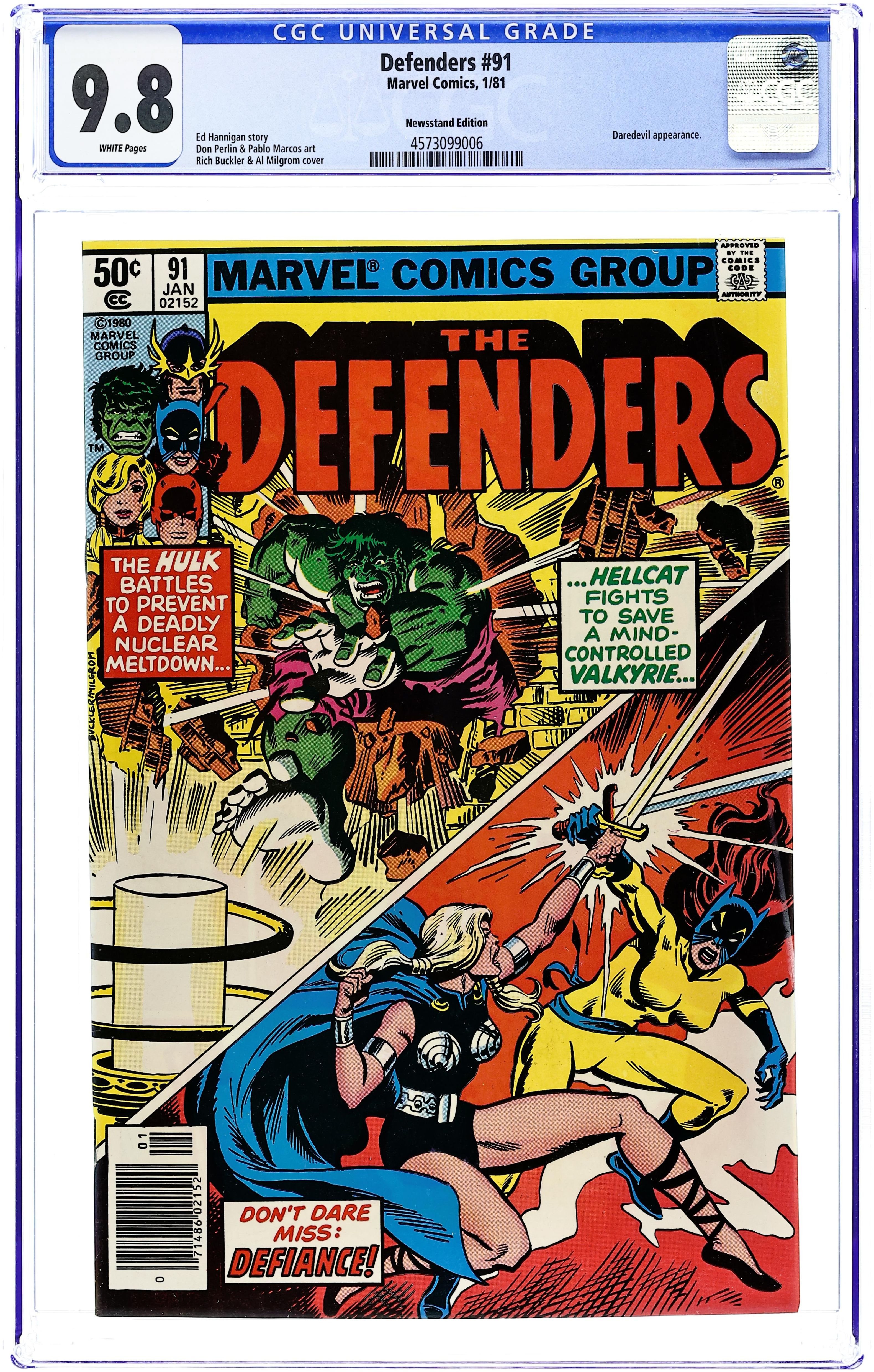 Newsstand Edition. Cover pencils by Rich Buckler, inks by Al Milgrom. The Dingo Kids Meets O. J. Simpson ad. Defiance, script by Ed Hannigan, pencils by Don Perlin (breakdowns) and Pablo Marcos (finished art), inks by Pablo Marcos; The Defenders and Daredevil have their final confrontation with the Mandrill; During the battle, the Mandrill is shot by his mother. Fury Unleashed! Hostess Fruit Pies with Captain America and Nick Fury. 36 pgs. Cover price $0.50.