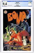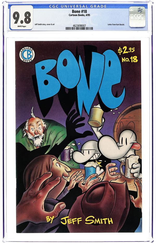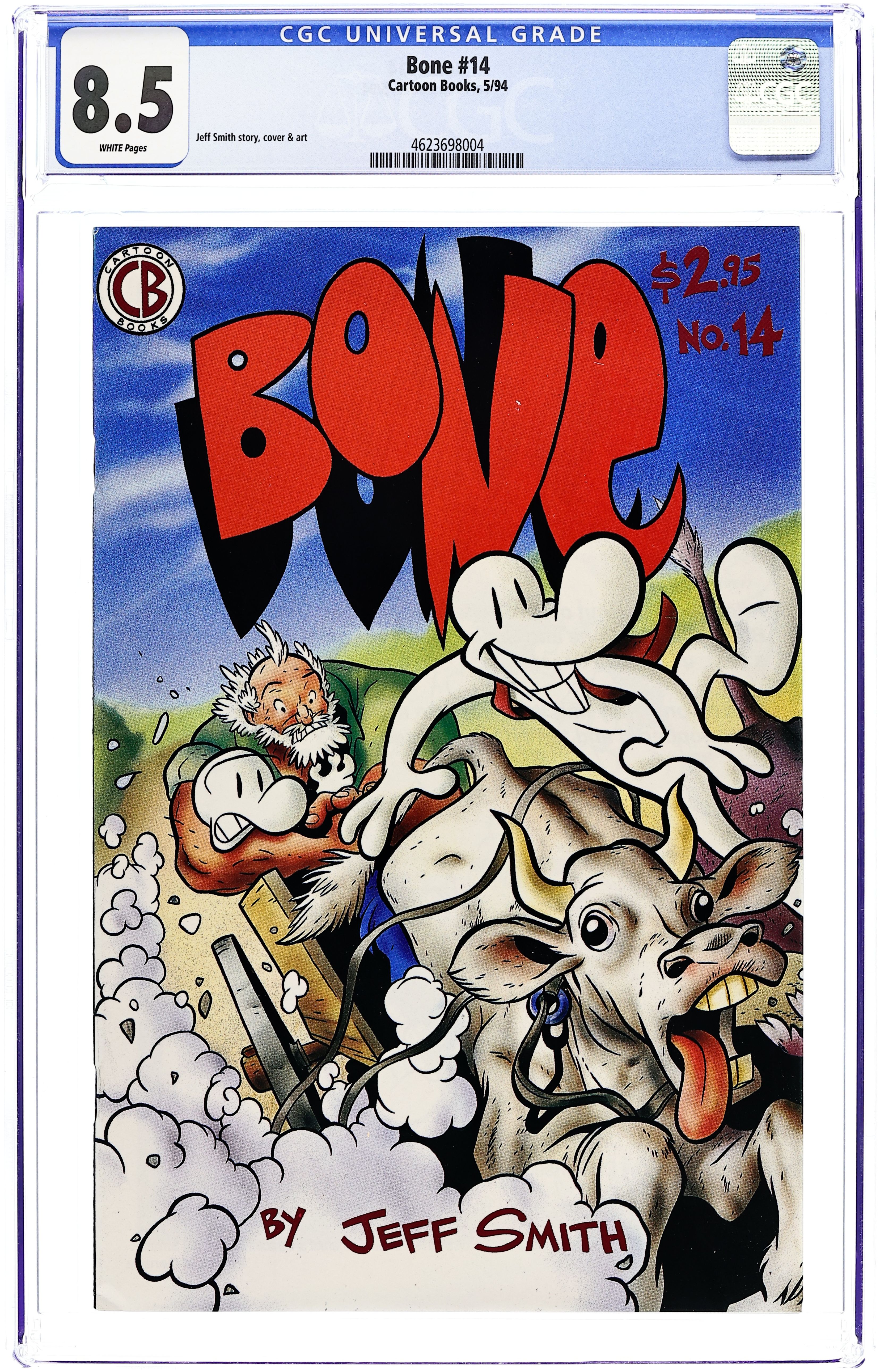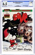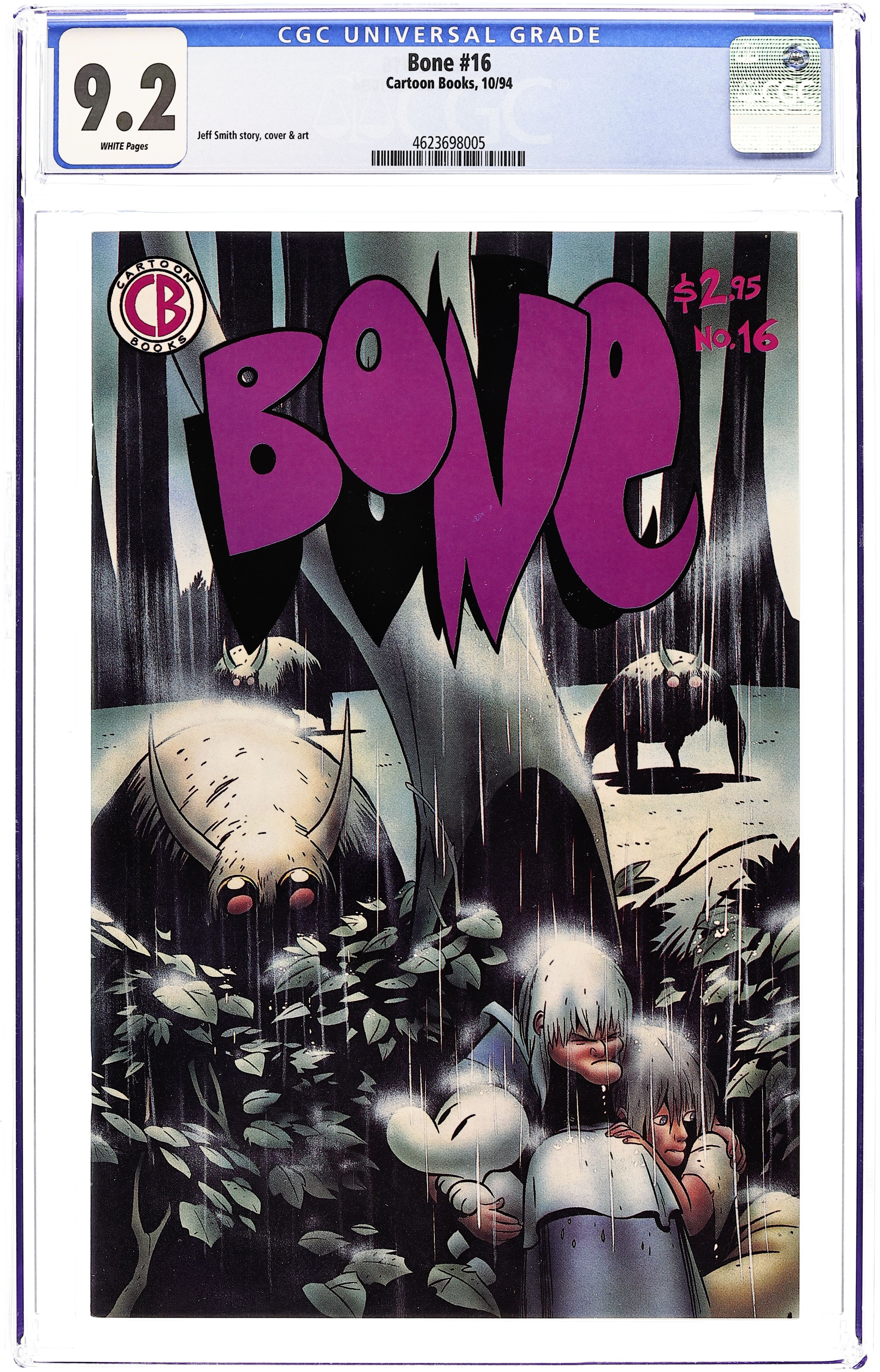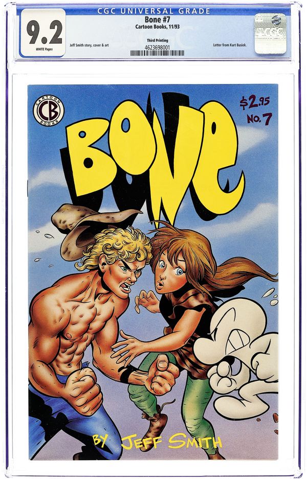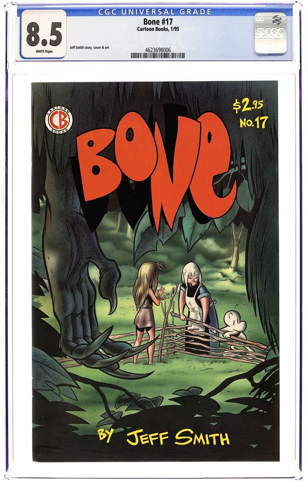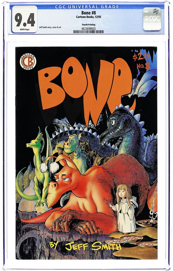 Cover art by Jeff Smith. Untitled story, script and art by Jeff Smith; The Dragon saves Fone Bone, Thorn and Gran'ma Ben from the Rat Creatures. This is a first printing. Most issues from #1-12, and possible some beyond, have been reprinted. Reprints may be identified by a 2nd, 3rd, 4th, 5th, etc. printing notice inside the comic. 28 pgs. $2.95. This is a first printing. Most issues from #1-12, and possible some beyond, have been reprinted. Reprints may be identified by a 2nd, 3rd, 4th, 5th, etc. printing notice inside the comic. Cover price $2.95.