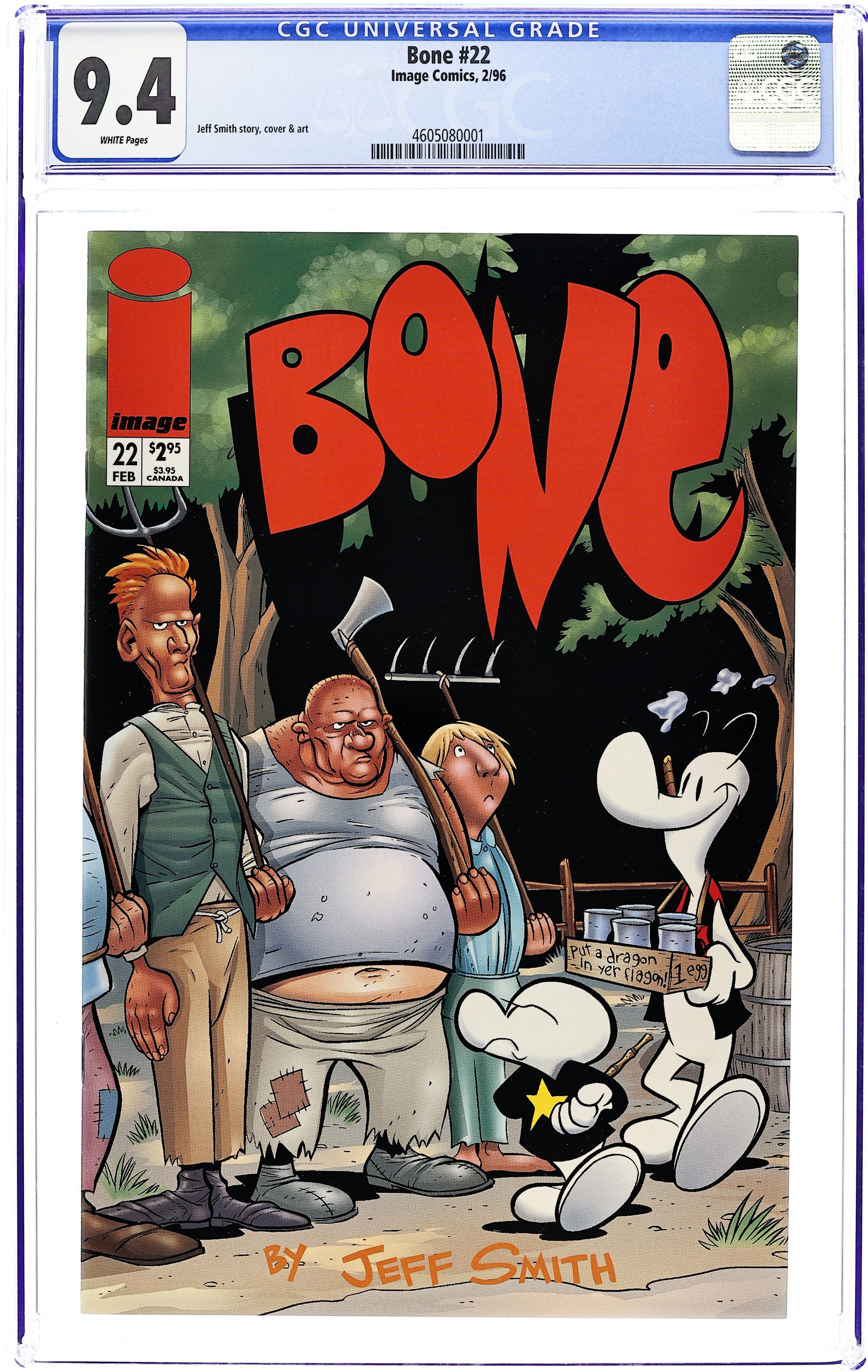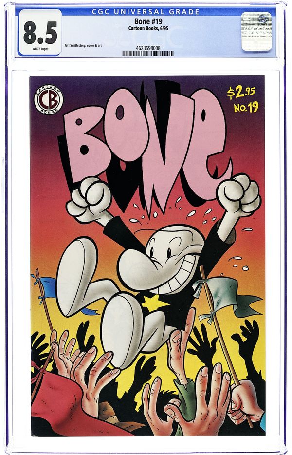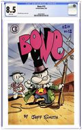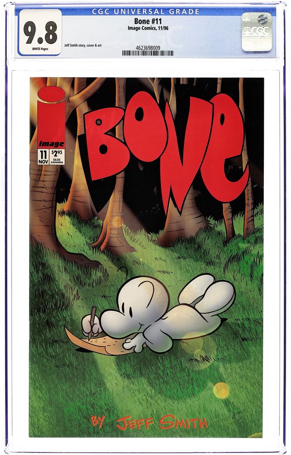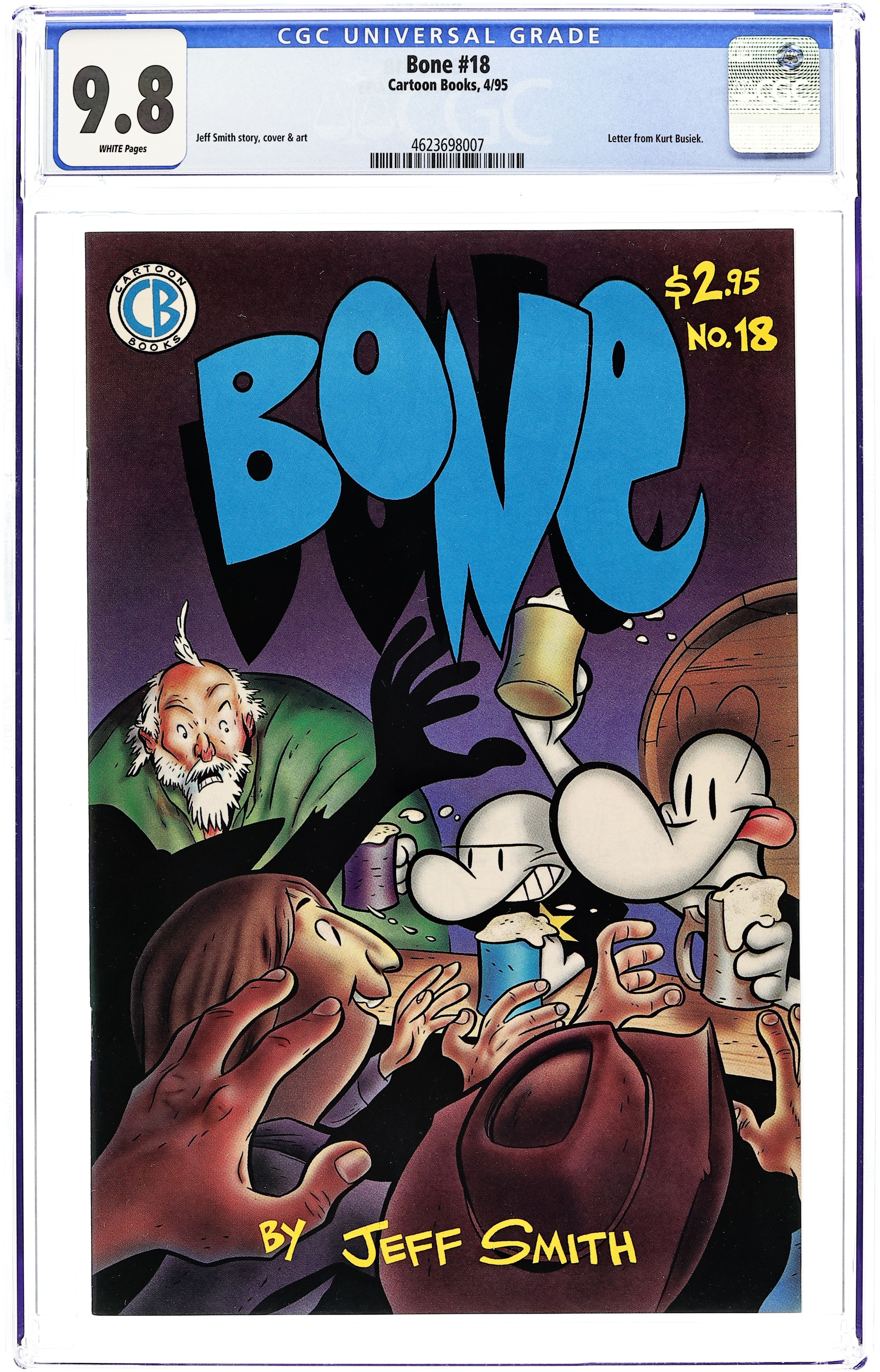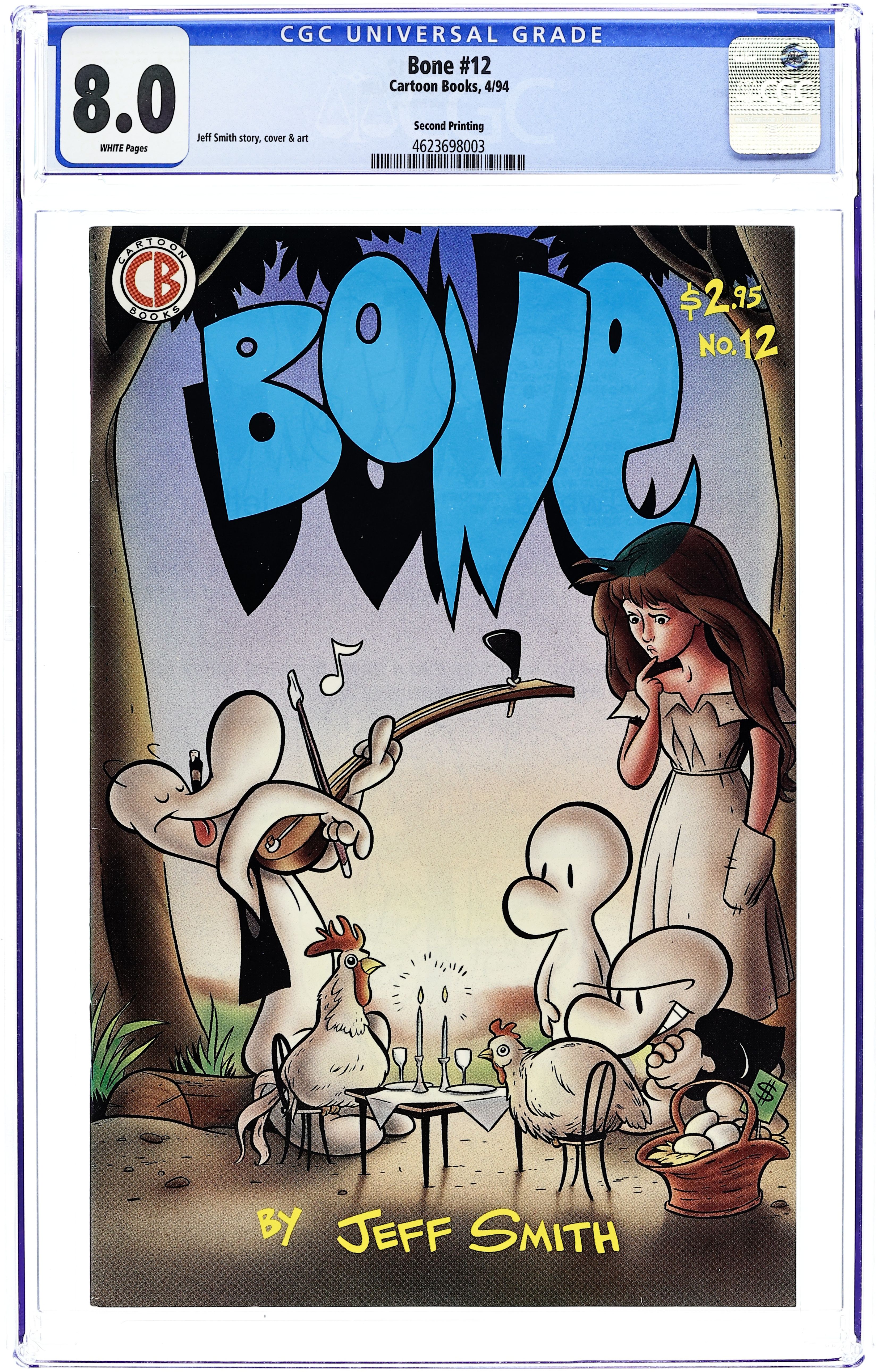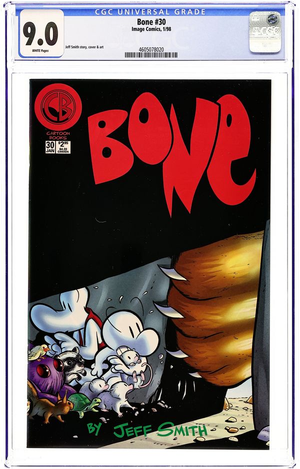 Cover art by Jeff Smith. Untitled story, script and art by Jeff Smith; The Dragon saves Fone Bone, Thorn and Gran'ma Ben from the Rat Creatures. This is a first printing. Most issues from #1-12, and possible some beyond, have been reprinted. Reprints may be identified by a 2nd, 3rd, 4th, 5th, etc. printing notice inside the comic. 28 pgs. $2.95. This is a first printing. Most issues from #1-12, and possible some beyond, have been reprinted. Reprints may be identified by a 2nd, 3rd, 4th, 5th, etc. printing notice inside the comic. Cover price $2.95.