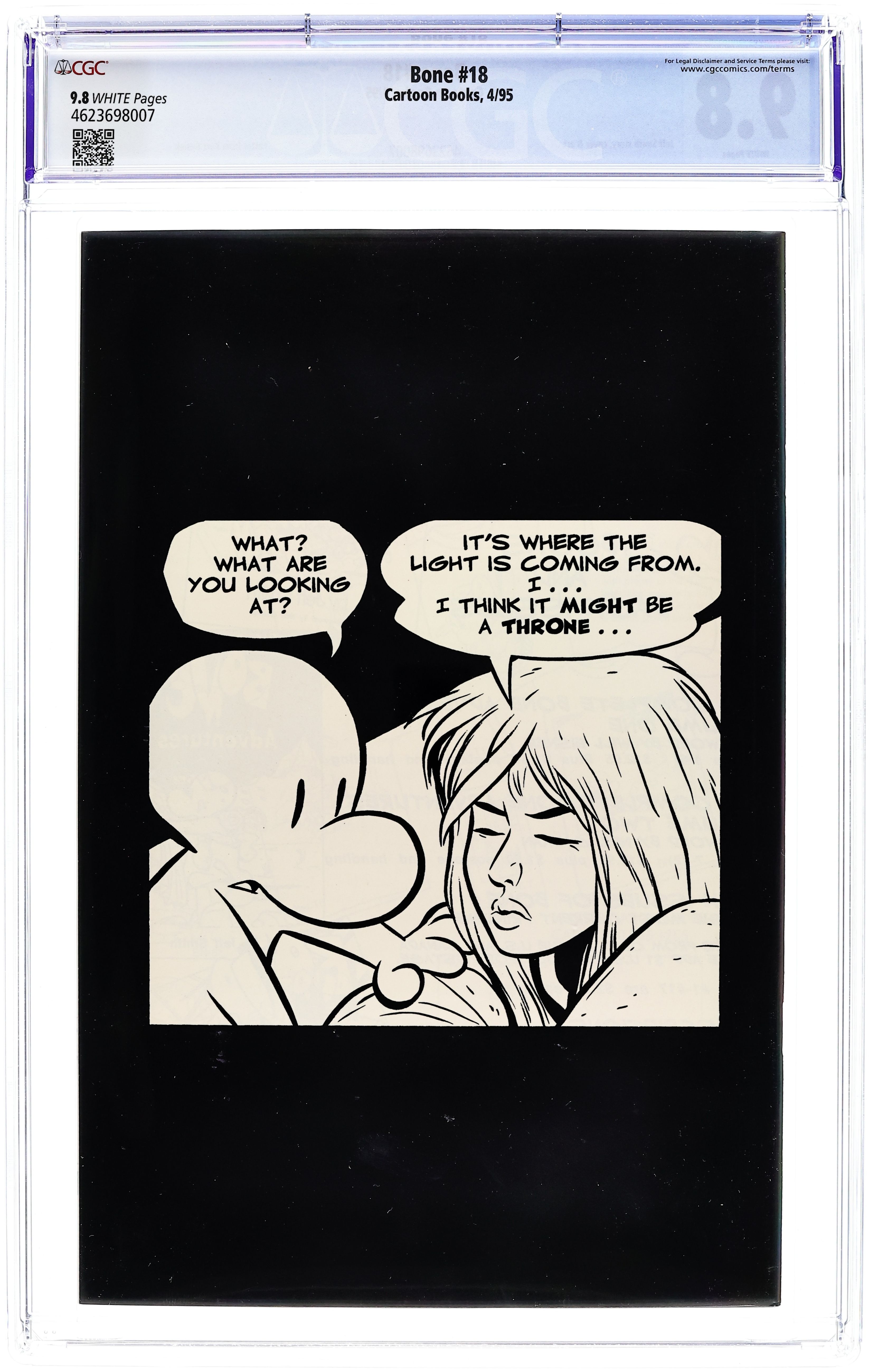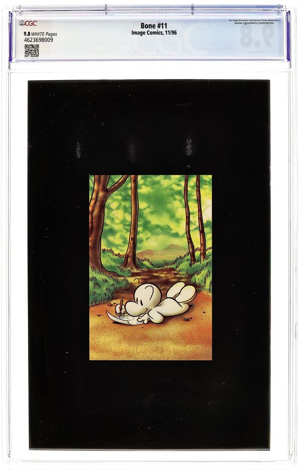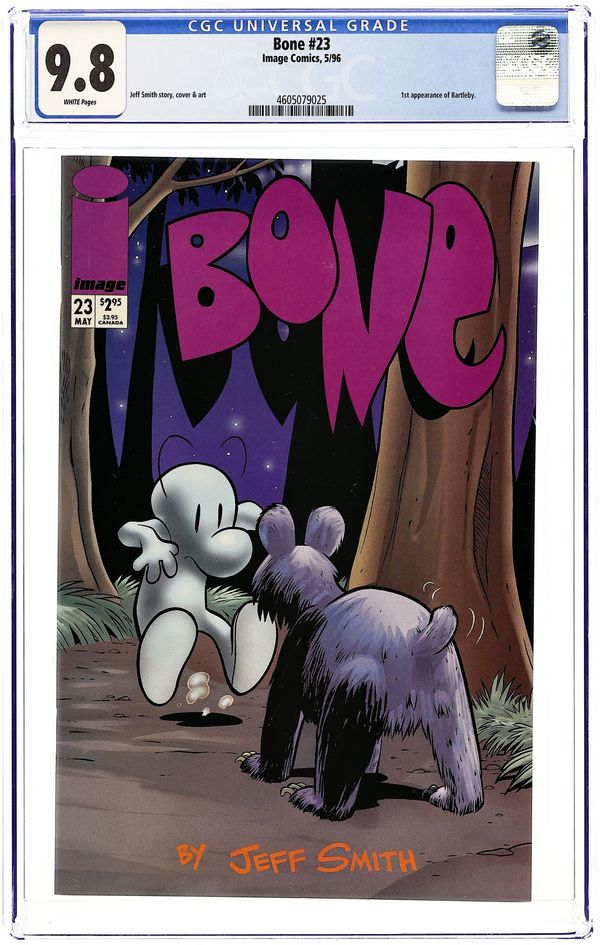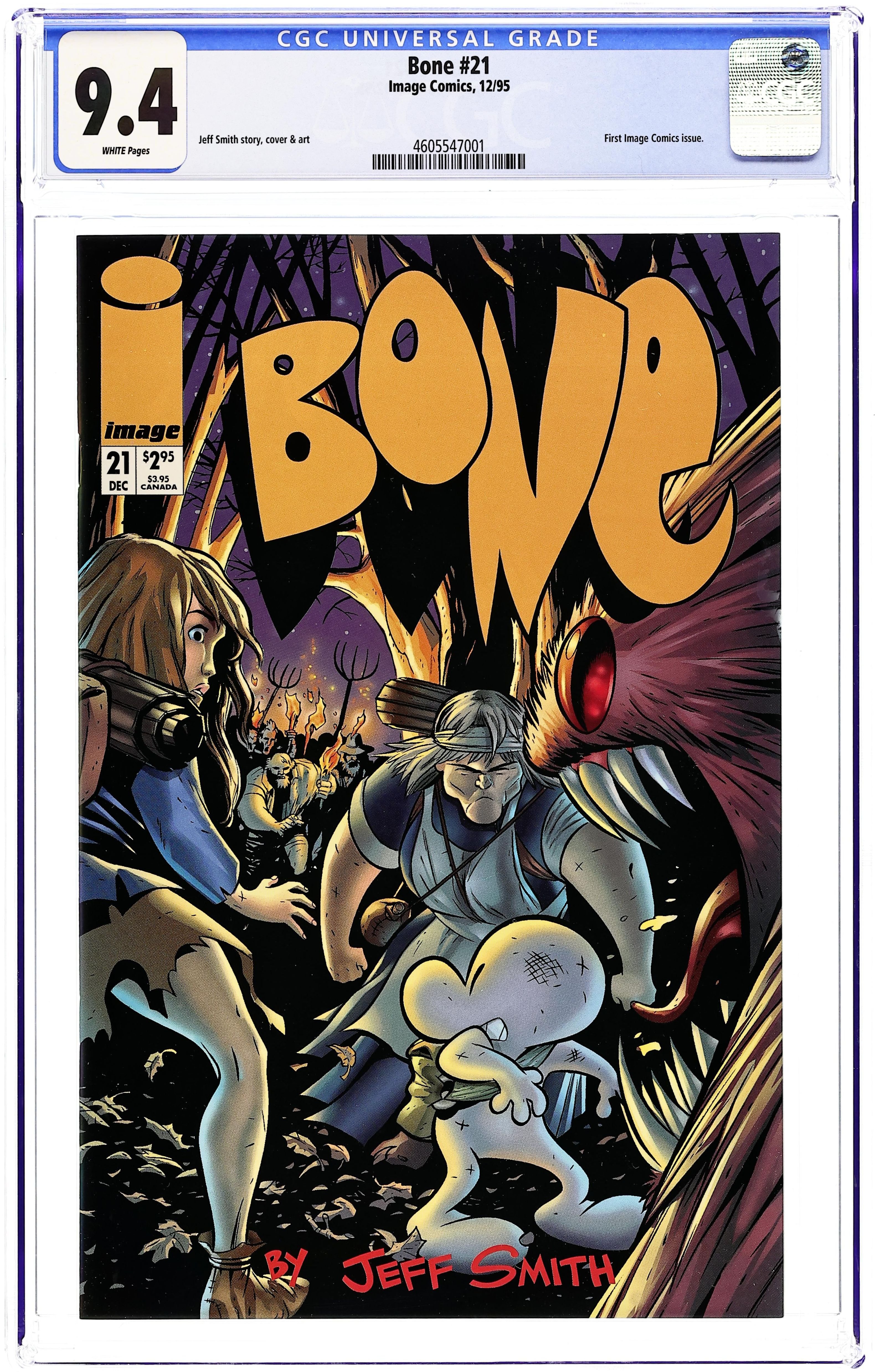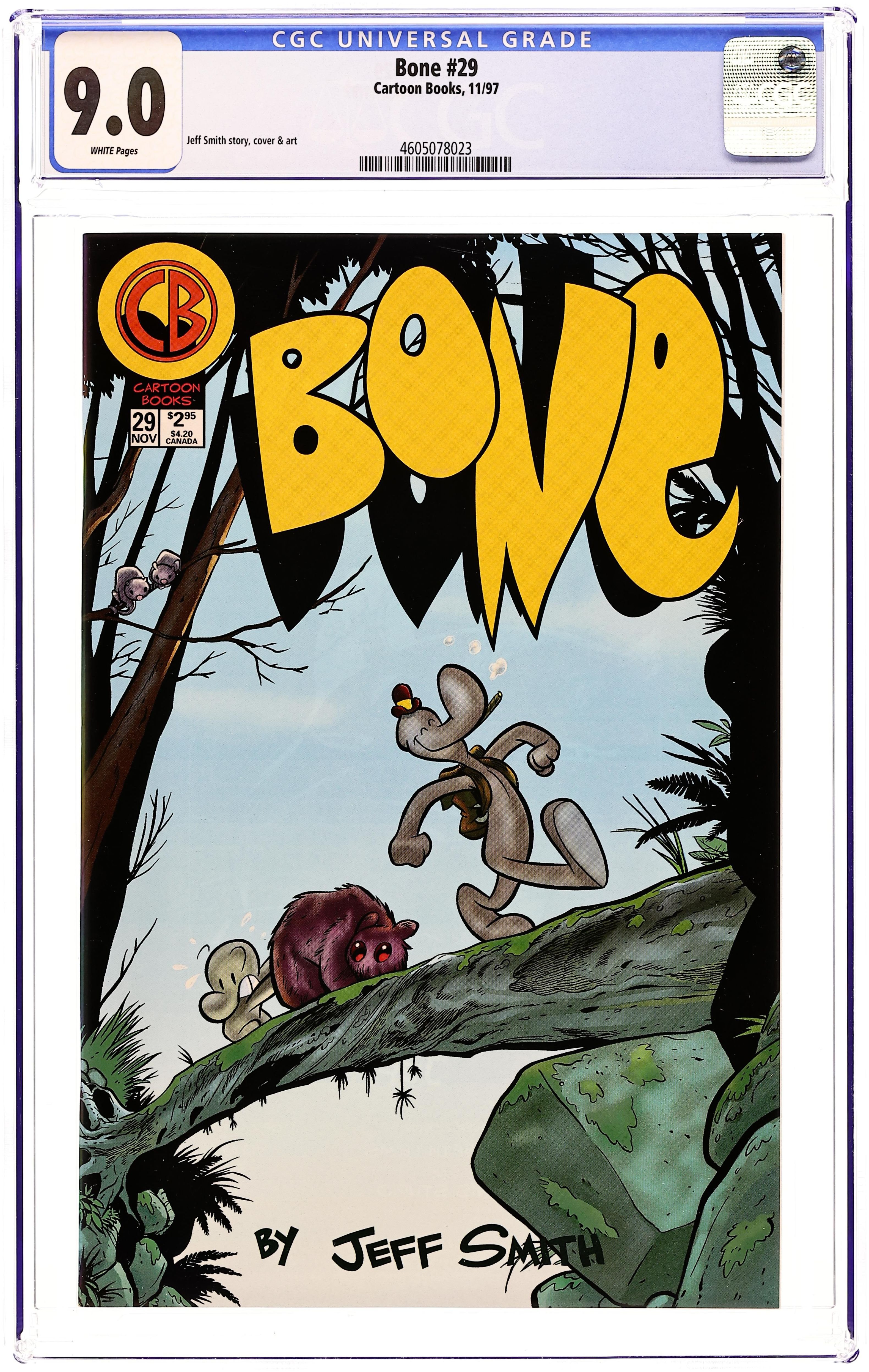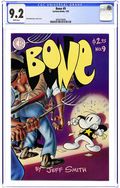 Cover art by Jeff Smith. Untitled story, script and art by Jeff Smith; The Dragon saves Fone Bone, Thorn and Gran'ma Ben from the Rat Creatures. This is a first printing. Most issues from #1-12, and possible some beyond, have been reprinted. Reprints may be identified by a 2nd, 3rd, 4th, 5th, etc. printing notice inside the comic. 28 pgs. $2.95. This is a first printing. Most issues from #1-12, and possible some beyond, have been reprinted. Reprints may be identified by a 2nd, 3rd, 4th, 5th, etc. printing notice inside the comic. Cover price $2.95.
