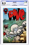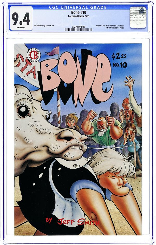 Cover art by Jeff Smith. Untitled story, script and art by Jeff Smith; Phoney Bone's scheme to get folks to bet on the Mystery Cow in the race is in full swing; Fone Bone is attacked by Rat Creatures. This is a first printing. Most issues from #1-12, and possible some beyond, have been reprinted. Reprints may be identified by a 2nd, 3rd, 4th, 5th, etc. printing notice inside the comic. 28 pgs. $2.95. This is a first printing. Most issues from #1-12, and possible some beyond, have been reprinted. Reprints may be identified by a 2nd, 3rd, 4th, 5th, etc. printing notice inside the comic. Cover price $2.95.