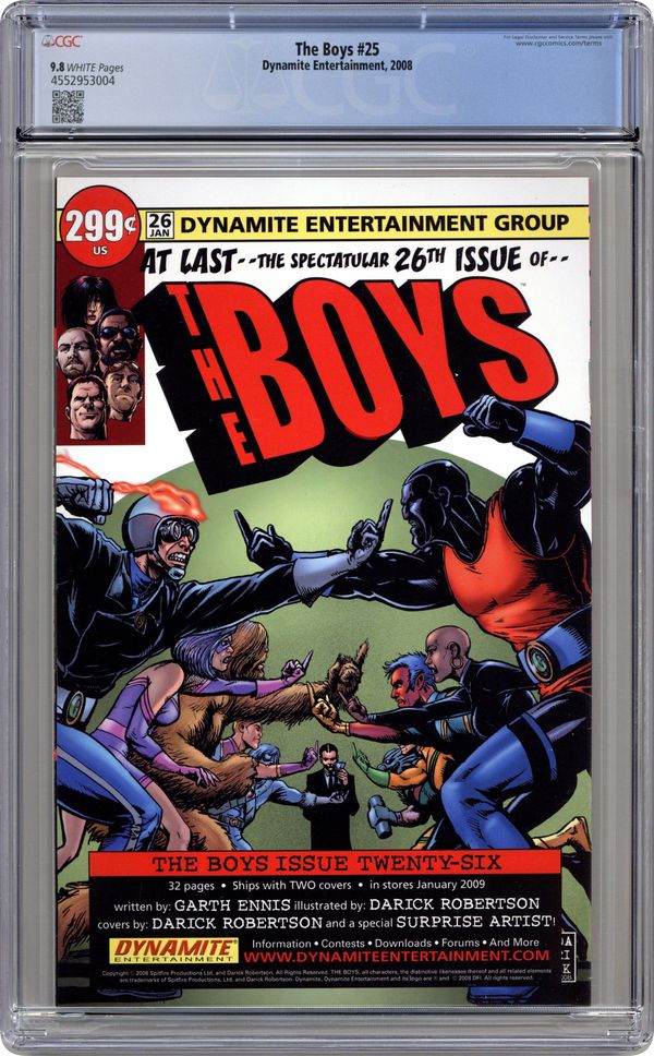 Good For The Soul: Part 3 - by Garth Ennis & Darick Robertson The most talked about comic of the year continues from Dynamite Entertainment, writer/co-creator Garth Ennis and artist/co-creator Darick Robertson! Hughie visits The Legend, determined to find out more about The Boys - their history, their personalities, and their mysterious hidden agenda. Meanwhile, Annie January (alias Starlight) has her own doubts about membership of The Seven. This storyline also reveals a little more about the other members of the team - beginning with Butcher, and his relationship with CIA director Susan Rayner! Cover price $2.99.