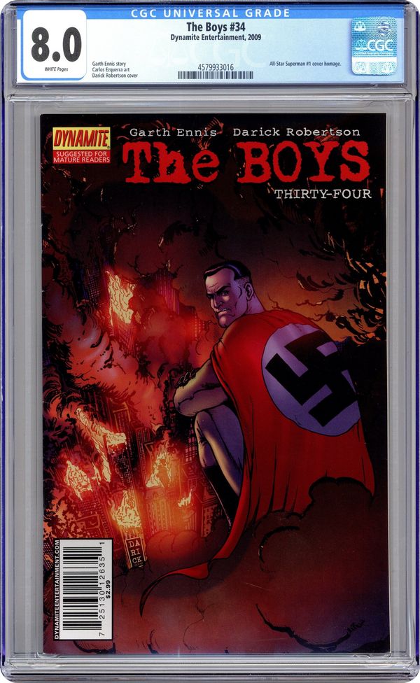 Stormfront: the super-nazi, the Aryan demigod, the worst of the Third Reich's racial dreams come true... versus what's left of The Boys. Can our ragged little band defeat this dreadful ubermensch? Will the Female ever awaken from her coma? Will the cavalry arrive in time, or ever? All this and more, in the bonesnapping, gut-rupturing conclusion to The Self Preservation Society. Cover price $2.99.