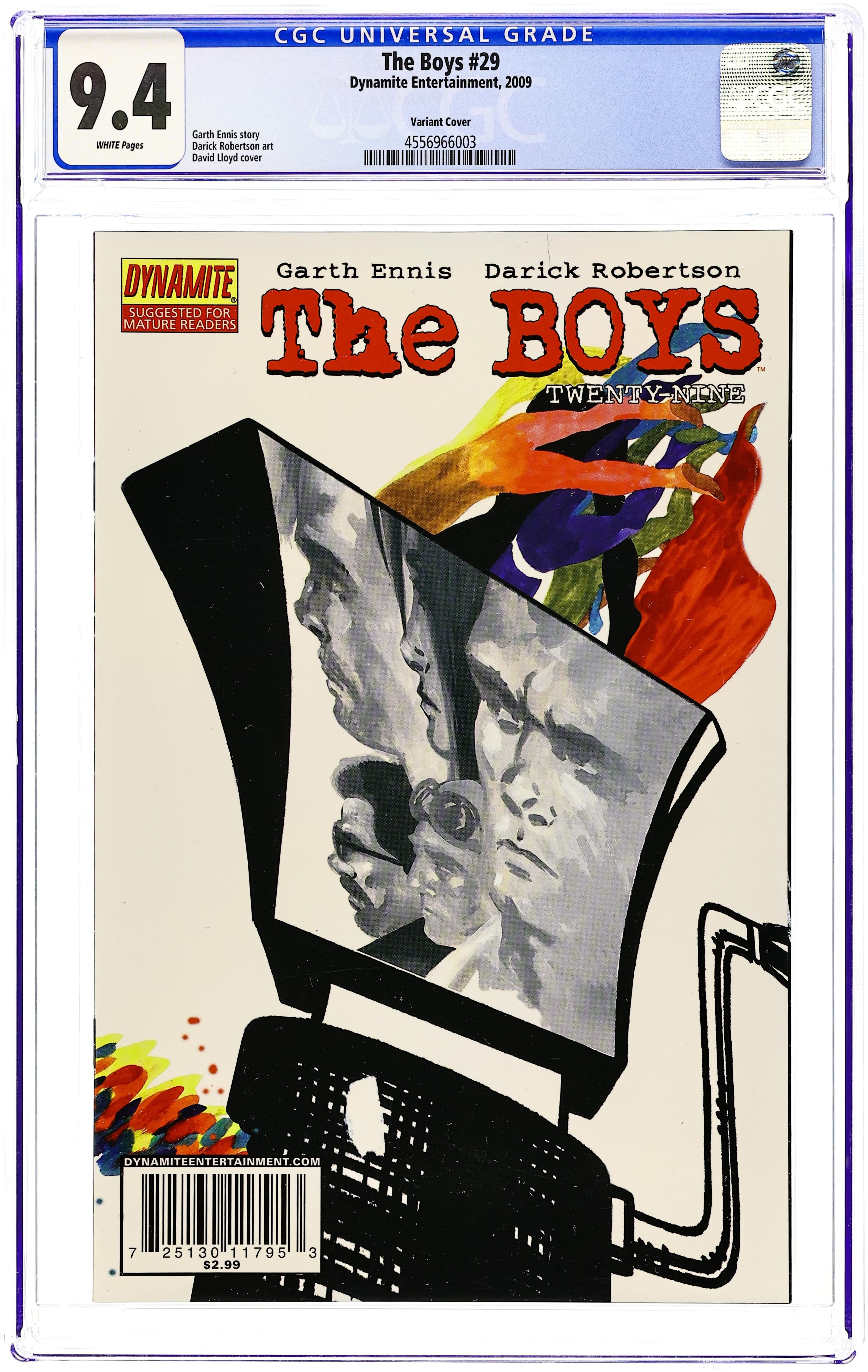 Cover by David Lloyd. Writer: GARTH ENNIS Penciller/Inker: DARICK ROBERTSON Desperate times result in extremely desperate measures, as the foulest secrets of the G-Men are revealed and Hughie leads the Boys to battle. We Gotta Go Now reaches its incendiary conclusion... and things will never be the same. Cover price $2.99.