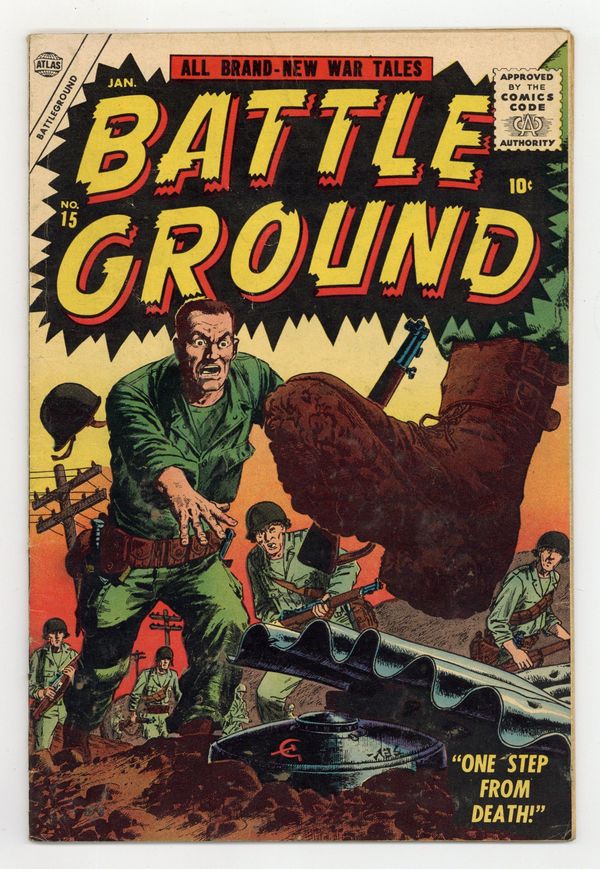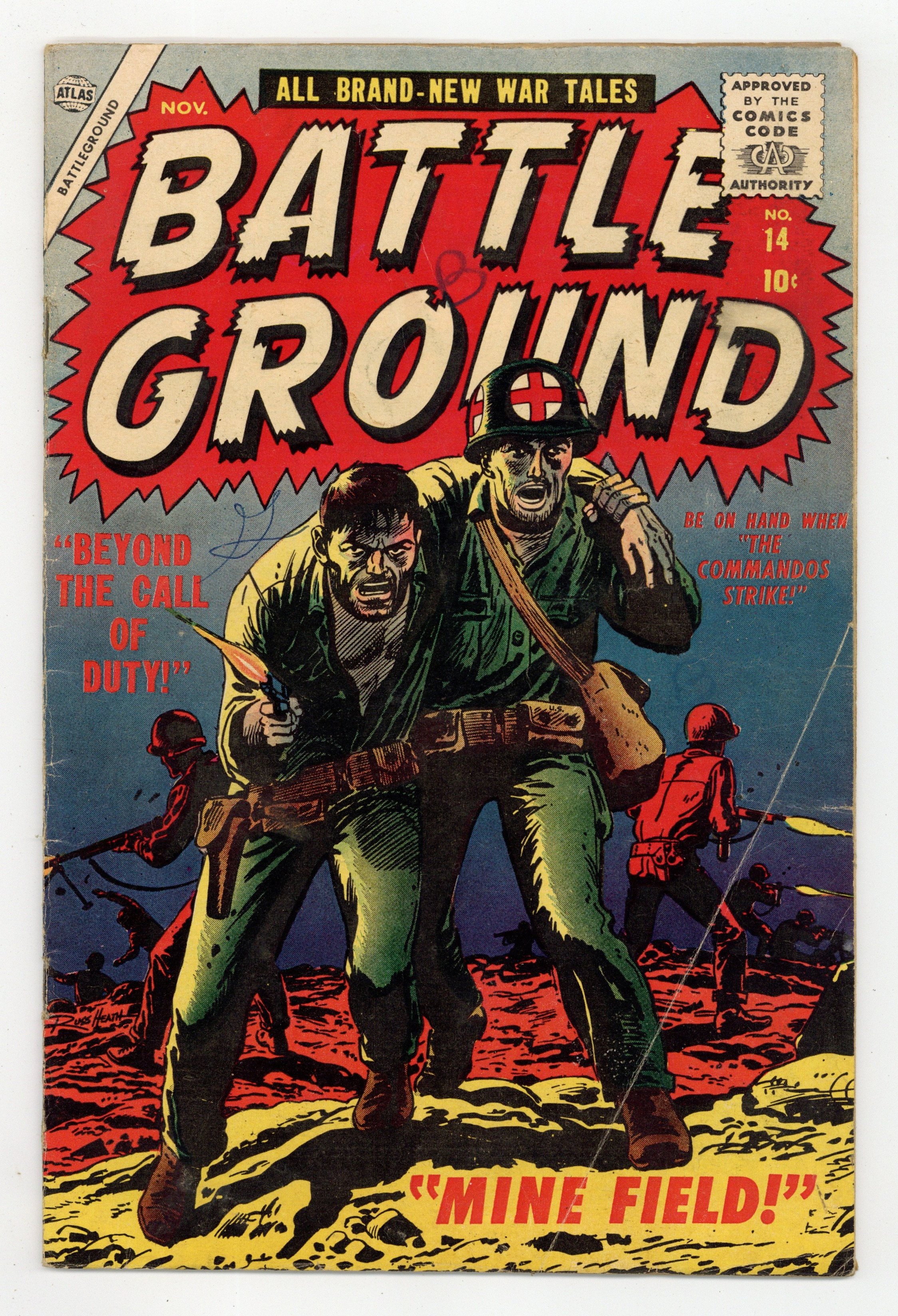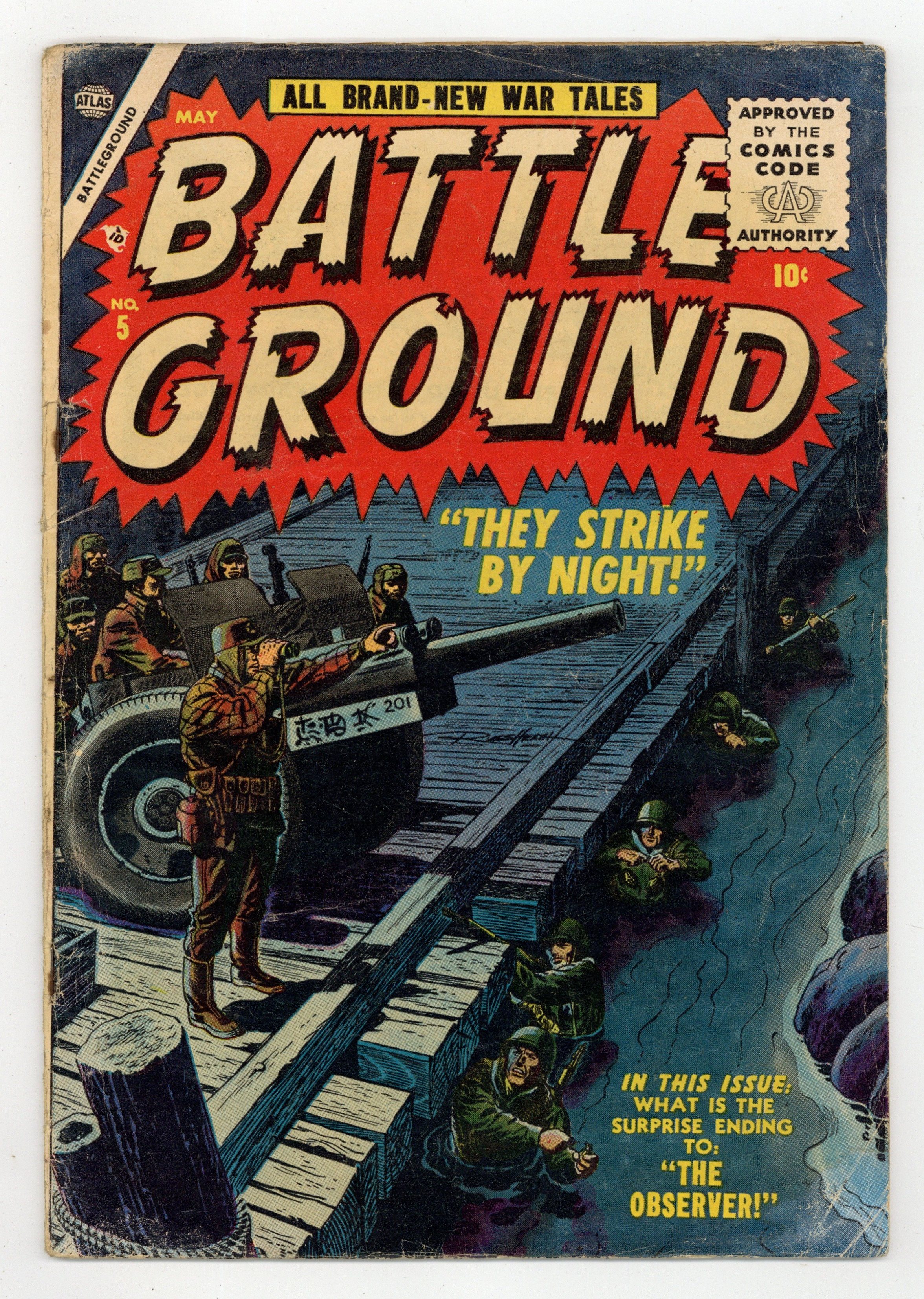 "Beyond the Call of Duty!" (art by Joe Maneely), "The Commandos Strike!" (art by Pete Morisi), "Mine Field!" (art by Jack Kirby), "Attack at Dawn!" (art by Bill Benulis), "The Night Raiders" (art by Don Heck), and a two-page text story, "Strange Victory." Russ Heath cover. Cover price $0.10.