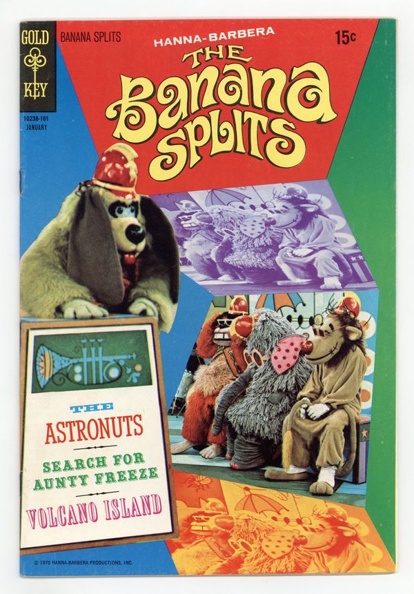 Photo cover. Comic book adventures of the Banana Splits, Fleegle, Bingo, Drooper, and Snorky, from the Saturday morning show "The Banana Splits Adventure Hour which aired from 1968 to 1970. The Banana Splits in "Volcano Island," "The Search for Auntie Freeze," and "The Astronuts." Issue also has Gold Key Comics Club News. No story/art credits given. No. on cover: 10238-101 January. Cover price $0.15.