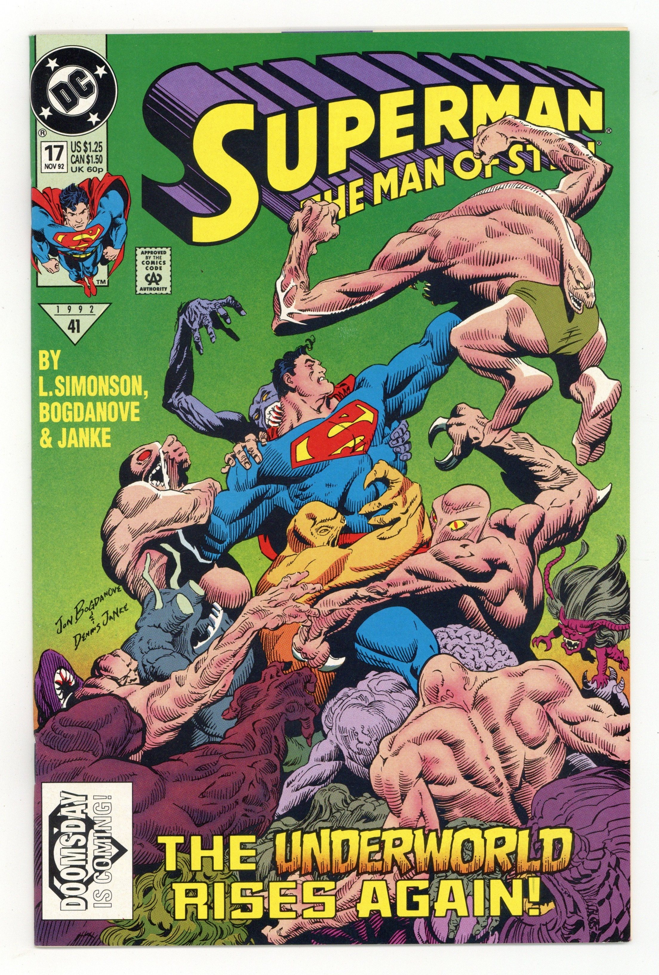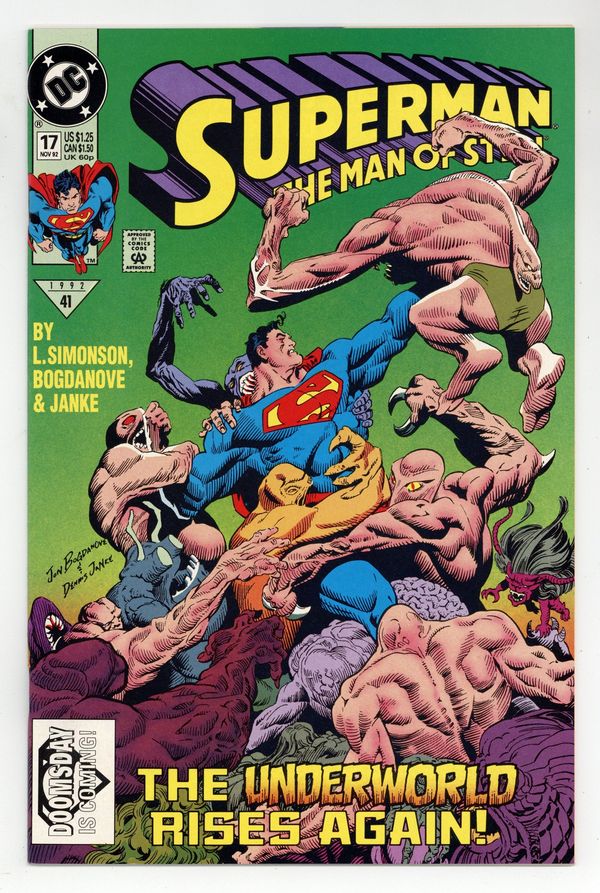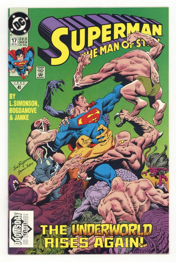 First Printing. Newsstand Edition. Part 1 of the 7-part 'Doomsday': A pivotal event is coming in the Man of Steel's life as Doomsday arrives...and Superman would be best served to stay out of the way! Continues in Justice League America (1987) #69 and then in Superman (1987) #74. Written by Louise Simonson, with art and cover by Jon Bogdanove and Dennis Janke. Cover price $1.25.