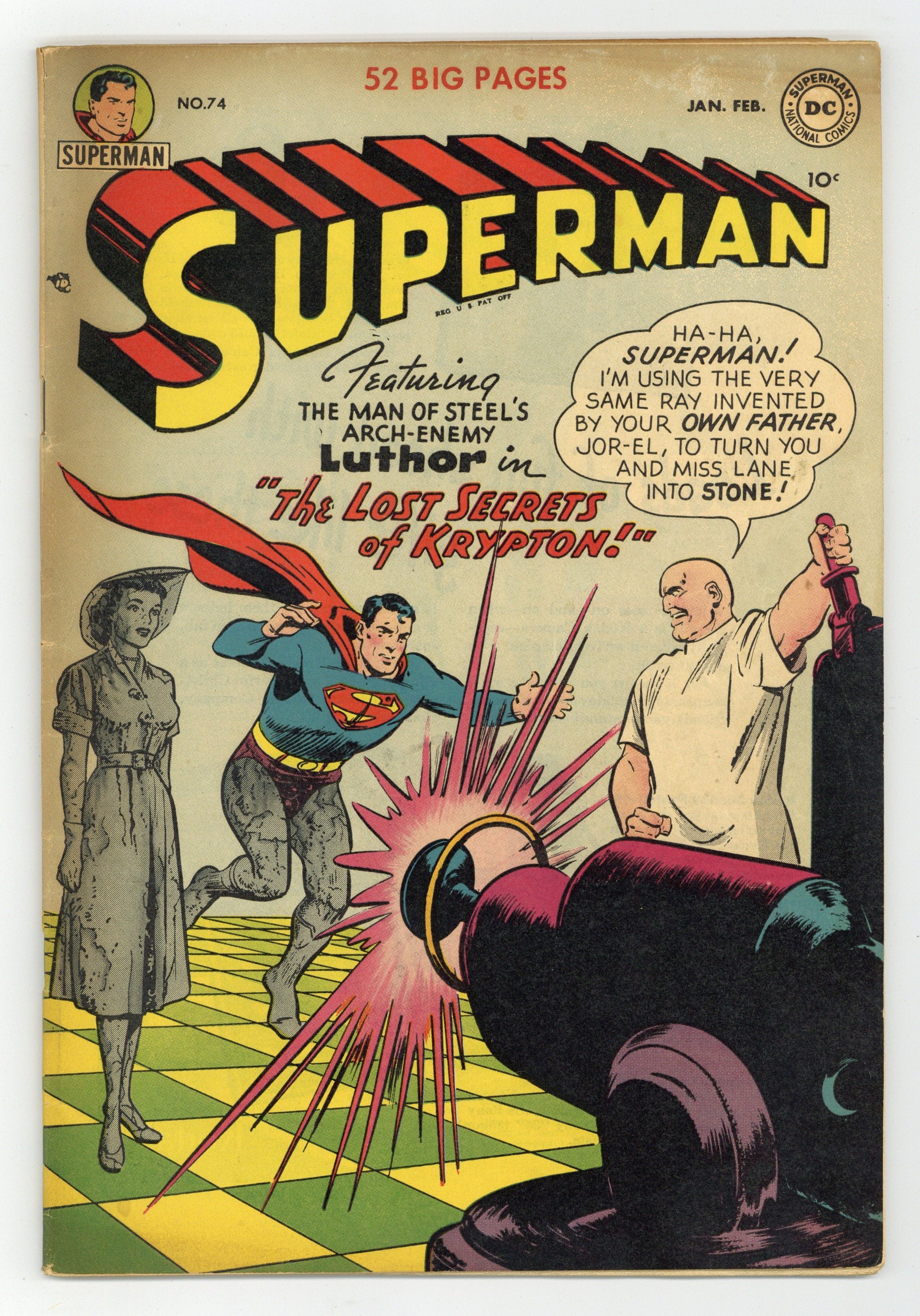 Misprinted Edition with #74 on cover. Cover art by Al Plastino. The Prankster's Star Pupil starring Superman and The Prankster, script by Edmond Hamilton, pencils by Wayne Boring, inks by Stan Kaye. Superman--Thrill Salesman, script by Edmond Hamilton, art by Al Plastino. So You Want To Be a G-Man? text story. The Man Who Stole Memories starring Superman, Moose Collins, and Professor Higgins, script by Bill Woolfolk; Lois Lane suffers temporary amnesia. Full-page ad for the feature film "Superman and the Mole Men." 52 Pages, Full Color. Cover price $0.10.