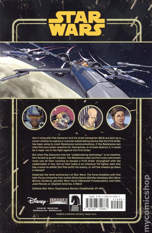 1st printing. Collects Star Wars Hyperspace Stories: Codebreaker (2025 Dark Horse) #1-4. Written by Ethan Sacks. Art by Marc Yarza and Jose Marzan Jr. Cover by Diego Galindo. Celebrate the 10th anniversary of Star Wars: The Force Awakens with this action-packed, all-ages adventure starring Poe Dameron and BB-8! Ace X-wing pilot Poe Dameron and his droid companion BB-8 are sent on a covert mission to capture a rumored code-breaking device that the First Order has been using to crack Resistance communications. If the Resistance can steal this encryption machine for themselves, or at least destroy it, it would be a major win in the fight against the First Order. But when Poe discovers that the code-breaking technology is actually a brilliant Munn girl being held captive, hes forced to go off-mission. Now, the Resistance pilot, his trusty astromech, and the young girl are on the run and in the crosshairs of an infamous TIE fighter pilot! Can Poe out-fly his enemy, or will the mission go down in flames? Celebrate the 10th anniversary of Star Wars: The Force Awakens with this high-flying mini-series from author Ethan Sacks (Old Man Hawkeye, Star Wars: Bounty Hunters), Marc Yarza (Werewolf Frankenstein), and Jose Marzan Jr. (Captain America, X-Men)! Softcover, 104 pages, full color. All Ages Cover price $19.99.