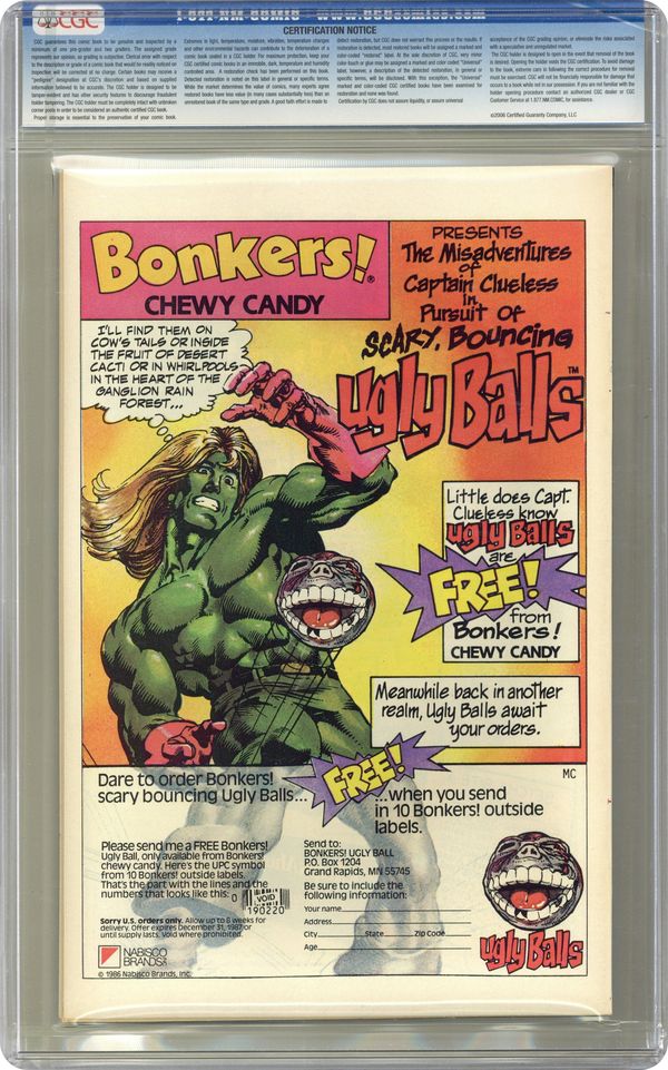 First Printing. Direct Edition. Ajax, Atalanta, Igor Drenkov, Red Guardian, Fantasma, Perun, Vostok, Leader (flashback), Abomination (flashback), Juggernaut (flashback), Dr. Doom (flashback), Thanos (flashback), and Modok (flashback), script by Peter David, pencils by Dale Keown, inks by Mark Farmer; Hulk finally has his vengeance on the Russian spy who didn't stop the gamma bomb test which turned Bruce Banner into the Hulk; origin of Hulk. Hulk/Wolverine pinup by Herb Trimpe. Hulk/Thor pinup by Ron Frenz and Al Milgrom. Grudge Match, script by Peter David, pencilsby Herb Trimpe, inks by Herb Trimpe and Charles Barnett. Hulk/Leader pinup by Sal Buscema. Hulk/Abomination pinup by Gil Kane. Psychological Ramifications of Gamma Radiation article by Peter David. Hulk/Krylorian Warriors pinup by Walt Simonson. Hulk/Thing pinup by Jim Starlin. Hulk/The Pantheon pinup by Dale Keown. 68 pgs. $2.50. Cover price $2.50.