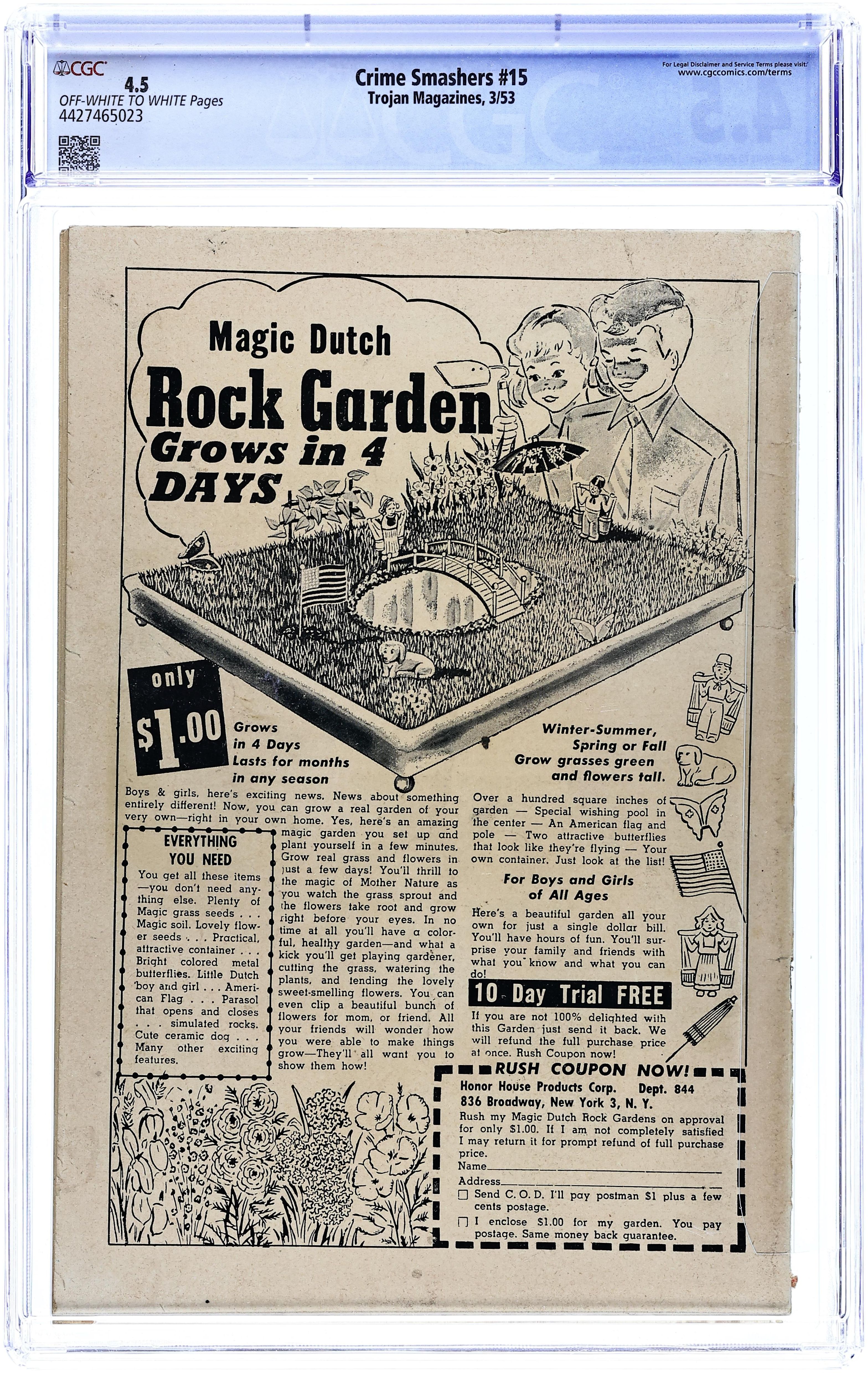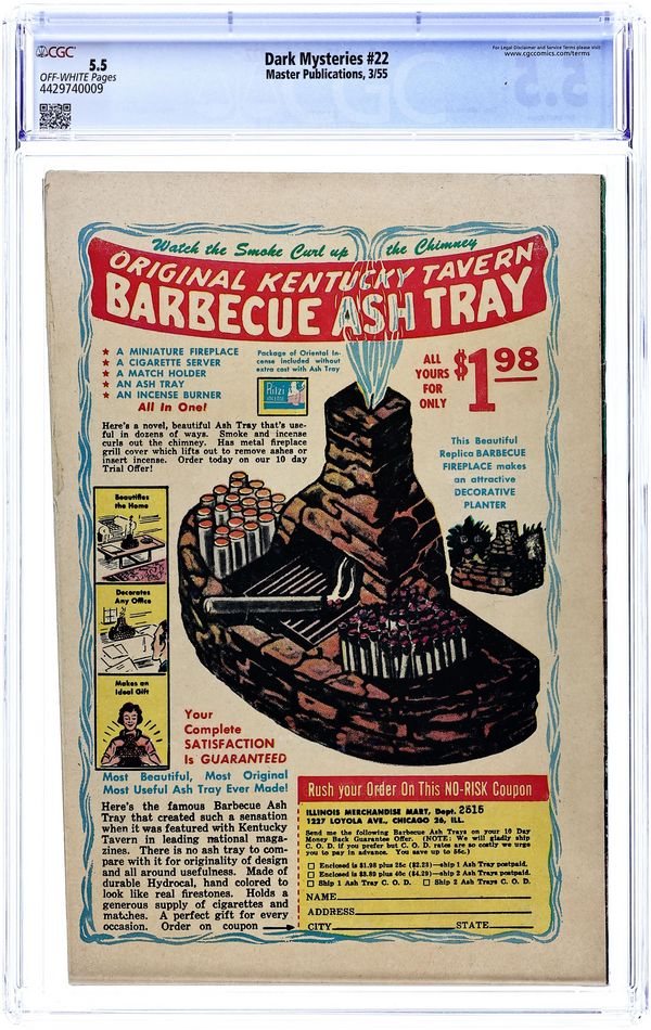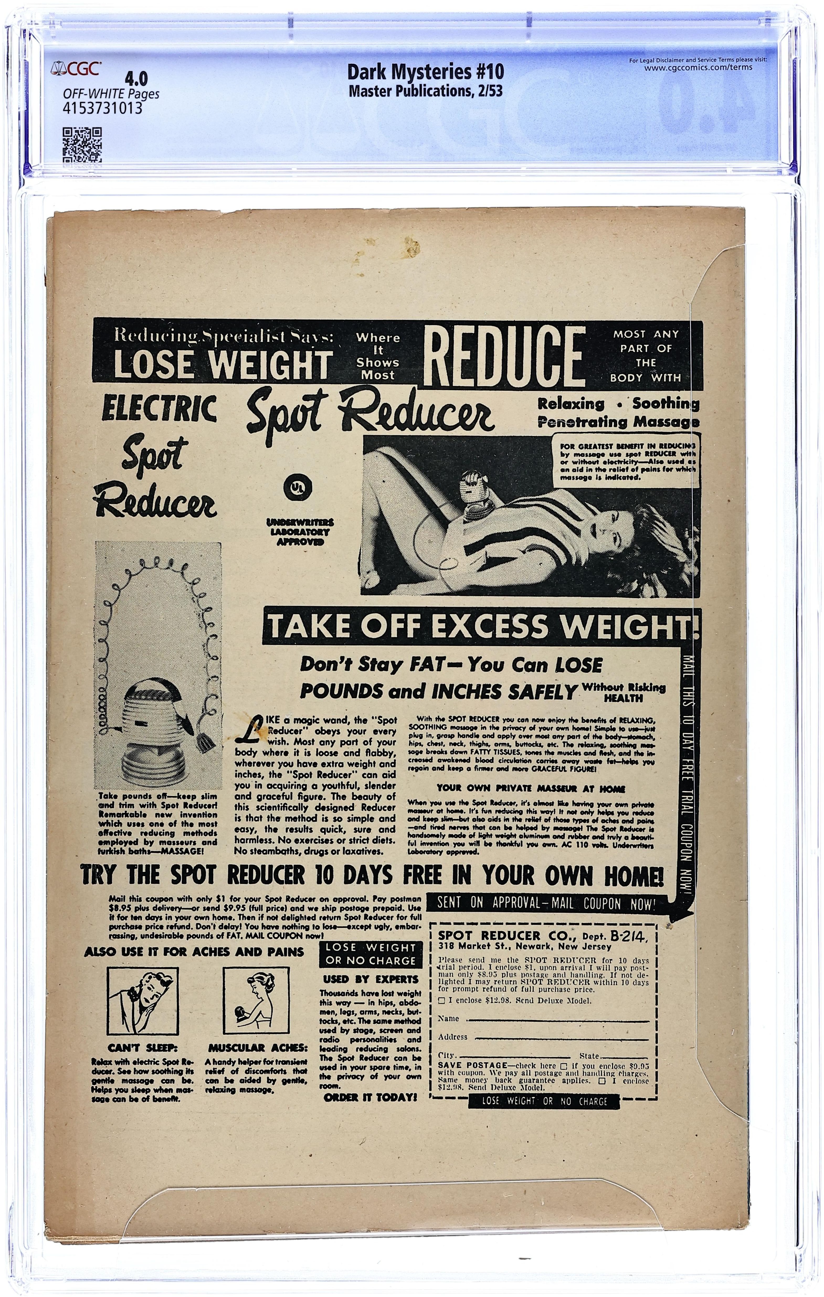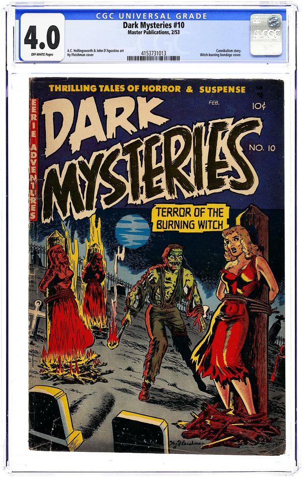 Cover art by Hy Fleishman. "The Note of Death," art by A. C. Hollingsworth; Norman Conway is made mayor on the promise to buy a haunted house from mobster Jake Lomax and turn it into a school; The witch Mary appears on the scene and starts fires. "Food For Thought!", art by John D'Agostino; Phil Stewart crashes his plane into the jungle and is rescued by mystery woman Kadira; She flees from her cannibal tribe and follows Stewart to the US to be his wife. "Grave Information" text story by Ellen Lynn. "Vampires Bite," art by Hy Fleishman; Doctor Ralph Bowan keeps a menagerie of freaks - a vampire, a ghoul and a witch - in his house, encased in big formaldehyde vats; When Bowan finds out that his wife Lily is cheating on him with his assistant Alan, he kills them and integrates them into his collection. "Sea of Ghosts," pencils by Harry Harrison; Captain Caleb Firth is a slave trader; He murders a cargo of Chinese workers to escape the coast guard; But one of them returns from the dead and comes for revenge. 36 pgs., full color. Cover price $0.10.