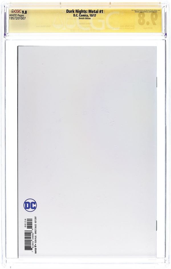 Blank Sketch Edition Variant Cover. Written by Scott Snyder. Art by Greg Capullo and Jonathan Glapion. The superstar BATMAN team of writer Scott Snyder and artist Greg Capullo reunite for a massive, universe-spanning event! DARK NIGHTS: THE FORGE and THE CASTING hinted at dark corners of reality that have never been seen till now! Now, as DARK DAYS: METAL begins, the Dark Multiverse is revealed in all its devastating danger-and the threats it contains are coming for the DC Universe! DARK DAYS: METAL is a DC event unlike any other-one that will push Batman, Superman and heroes of the Justice League beyond their limits to take on threats unlike any our world has ever seen! It will take the combined might of the World's Greatest Heroes as you've never seen them before to face what's coming their way! 40 pages, full color. Rated T+ Cover price $4.99.