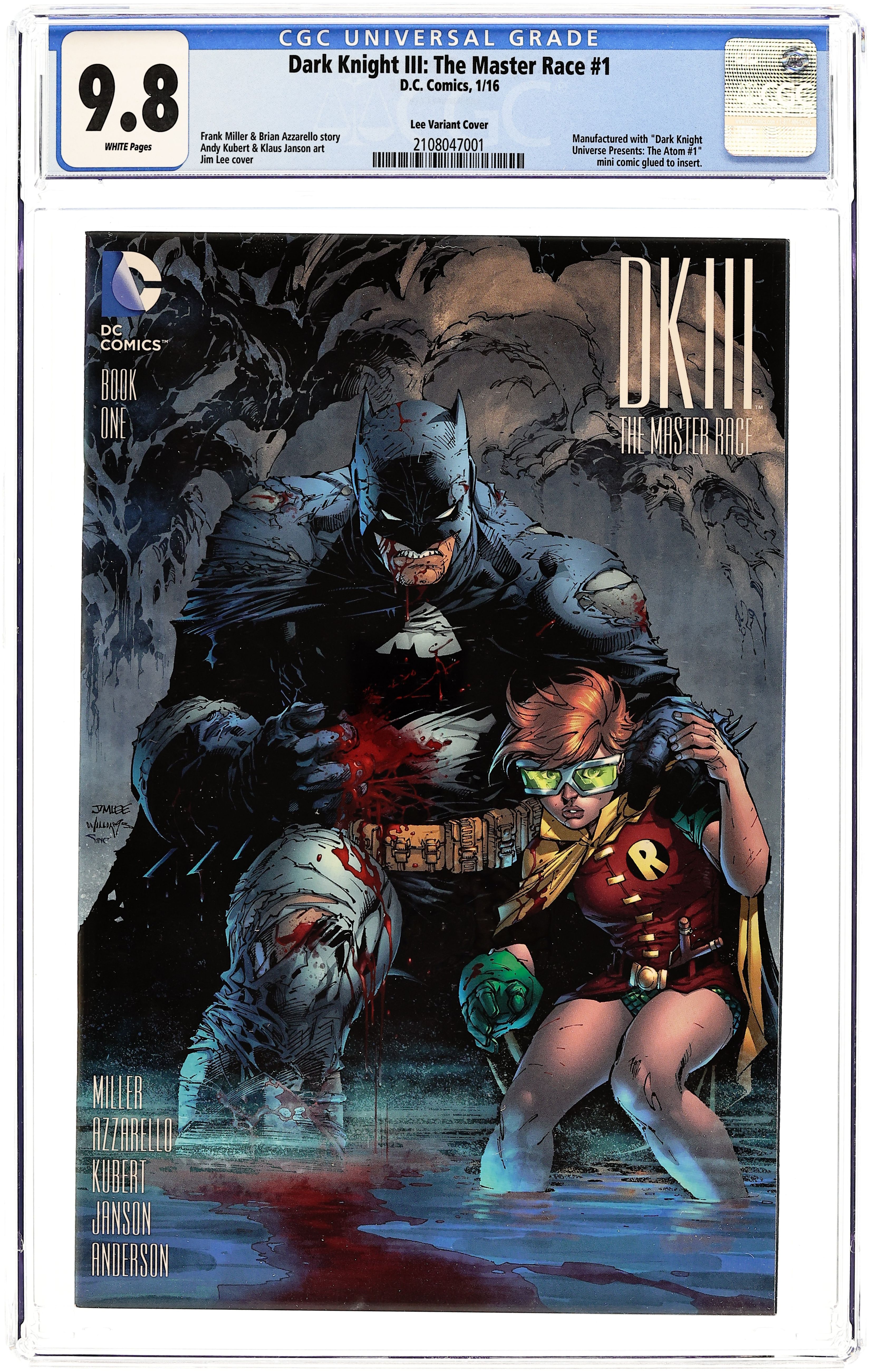 Limited 1 for 500 Retailer Incentive Variant Cover. Written by Frank Miller and Brian Azzarello. Art by Andy Kubert and Klaus Janson. Cover by Jim Lee. The epic ending you never saw coming is here because you demanded it! The Dark Knight rises again to face the dawn of the master race! 36 pages, full color. Includes a bound-in, 12 page mini-comic (5 1/2-in X 8 1/2-in): Dark Knight Universe Presents: Atom. #1