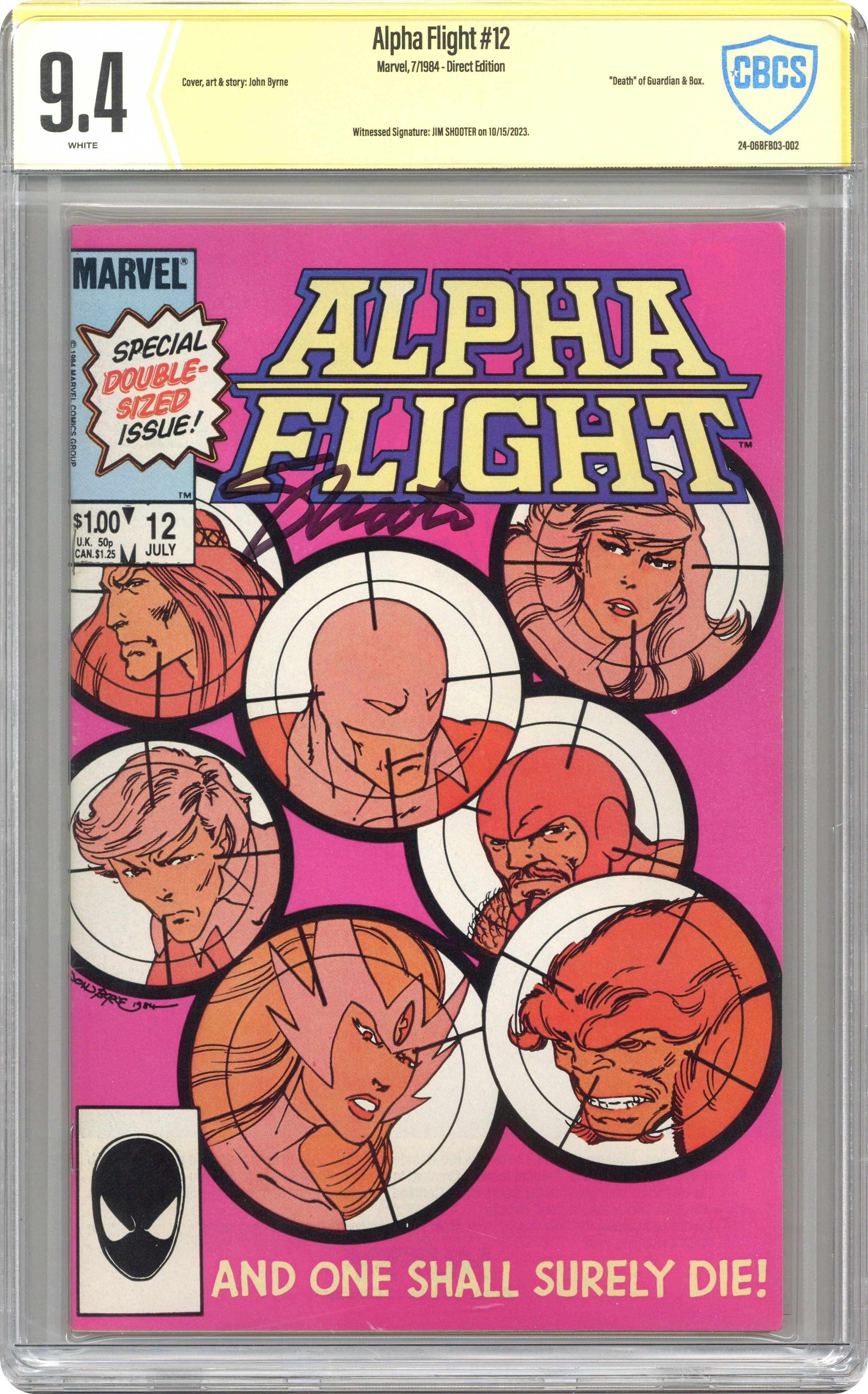 Direct Edition. Double-Size Anniversary Issue! "...And One must Surely Die!" Part 2 of 2. Story, art, and cover by John Byrne. Canada's premier super-team must face their greatest challenge to date - Omega Flight! It's an epic battle that not everyone will survive. Which member of Alpha Flight will meet their end? Find out in the tragic fiery conclusion. 48 pages Cover price $1.00.