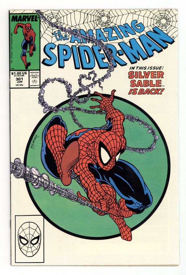 Direct Edition. "Death Toy!" Part 2 of 2. Script by David Michelinie. Pencils by Chris Marrinan. Mark Bagley. Inks by Keith Williams. Cover by Mark Bagley and Randy Emberlin. At the Tech-Toy warehouse, Cardiac and the wall-crawler come to a meeting of the minds about their pursuits of justice! Perhaps it's possible for them to work together after all! The next evening at Stane International, Spider-Man and Cardiac team up to stop the illegal manufacturing of military weapons! Could this be the beginning of a beautiful friendship? Not quite! Meanwhile, a new blood-hued super-villain makes his first savage kill...the first of many! Cameo appearances by Carnage, Mary Jane Watson, Ben Urich, Joy Mercado, and J. Jonah Jameson. Origin of Cardiac. (Notes: Cardiac returns in Amazing Spider-Man 376. The letters page contains a statement of ownership: average print run 470,075; average paid circulation 340,977.) 36 pages. $1.25 cover price. Cover price $1.25.