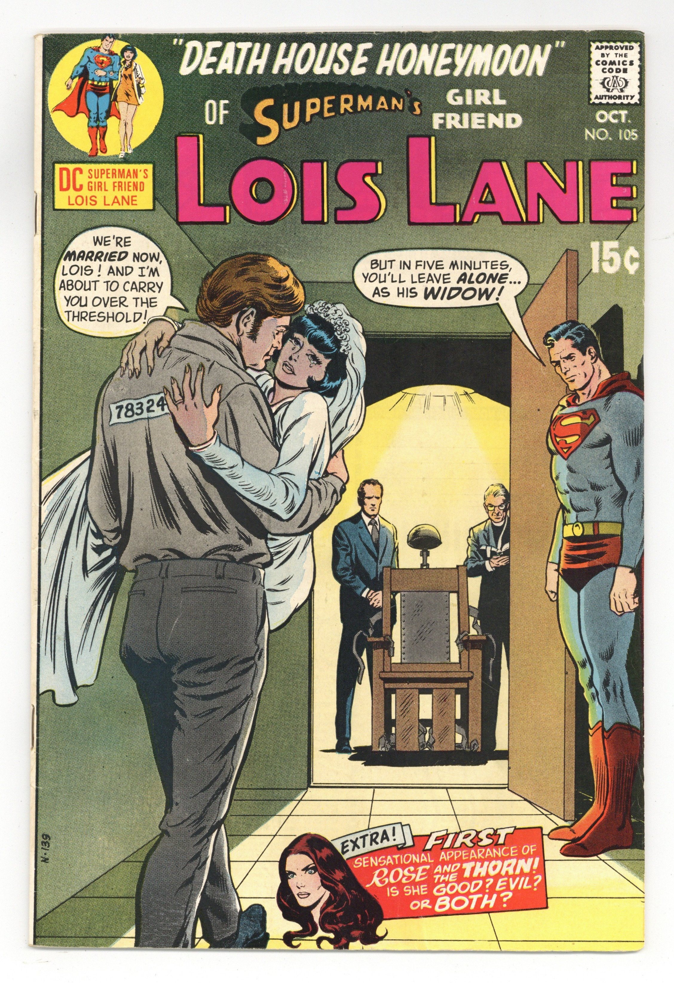 Cover pencils by Neal Adams, inks by Al Plastino. Lois Lane's Wedding Day!, script by Leo Dorfman, art by Kurt Schaffenberger; Lois goes undercover to expose a swindler running a lonely hearts' club scam, but he turns the tables on her by hiring a real minister so that her fake wedding to Clark Kent turns out to be real. The Wife of Superman!, script by Jerry Siegel, art by Kurt Schaffenberger; Lois is jealous because Lana has taken her old job and also flirts constantly with Superman (because no one knows Superman and Lois are married). Lana Lang's Romance with Superman VI!, script by Jerry Siegel, pencils by Curt Swan, inks by George Klein; Lois marries Superman and Lana Lang is sent to the future where she marries Superman IV, Superman and Lois's great-grandson (imaginary story). Lois Lane's Secret Identity!, script by Jerry Siegel, art by John Forte; Lois goes undercover as Lorelei Larue to catch the Society Bandit. The Silver Coin of Fate!, script by Robert Bernstein, art by Kurt Schaffenberger; Superman flips a coin to decide whether he will marry Lois or Lana; Lois wins, but during the ceremony, "Superman" is revealed to be a Bizarro-Superman. The Bride of Luthor! [The Wife of Superman's Foe! Part I], script by Jerry Siegel, art by Kurt Schaffenberger; Luthor kidnaps Lois and takes her to another planet, but the inhabitants of that world use their powers to reform Luthor. Test Your Lois Lane I.Q. activity page. The Son of Luthor! [The Wife of Superman's Foe! Part II]; Lois and Lex have a son who grows up to be a juvenile delinquent (imaginary story). The Devil and Lois Lane!, script by Leo Dorfman, art by Kurt Schaffenberger; When Superman overhears Lois tell her college boyfriend, Lance Jason, that she would sell her soul to the devil for a chance to marry Superman, he decides to teach her a lesson and masquerades as Satan, offering Lois her dream marriage in exchange for her soul. 84 Pages, Full Color. Cover price $0.25.