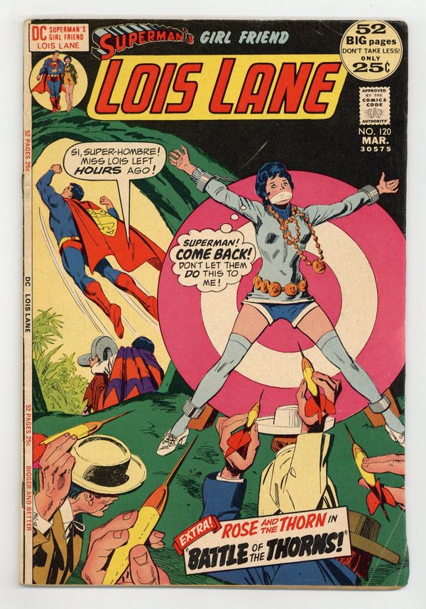 Tags: Superman$30.00Cover art by Dick Giordano. Who Killed Lucy Lane?, script by Cary Bates and Irene Vartanoff (Plot), pencils by Werner Roth, inks by Vince Colletta and Murphy Anderson (Superman heads); Searching for her missing sister Lucy, Lois finds her diary and learns that Lucy was working for the 100 as a spy, stealing secret plans for a super-weapon. Not All Thorns Come from Roses!, script by Robert Kanigher, pencils by Rich Buckler, inks by Mike Esposito; The Thorn encounters a woman wearing duplicates of her costume and weapons, which were created years ago by costume shop owner Arthur Talbot for the woman's mother to use for criminal purposes. Lois Lane - Volunteer Nurse!, art by Kurt Schaffenberger; Lois falls in love with an injured soldier when she volunteers as a nurses' aide, but he turns out to be a member of the 14 Karat Gang. 52 Pages, Full Color. Cover price $0.25.