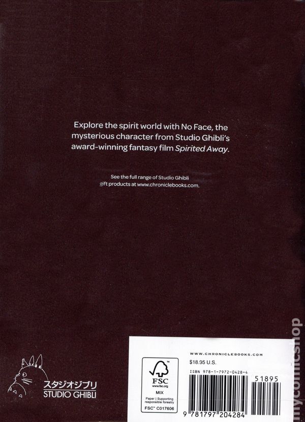 2nd and later printings. This novelty plush embroidered journal features No Face, the mysterious spirit from the award-winning masterpiece Spirited Away from legendary animation studio Studio Ghibli in Japan. With lined interiors and full-color artwork on the front and back pages, this collectible, irresistible notebook is sure to cast a spell on Studio Ghibli fans and animation lovers of all ages! Hardcover, 5-in. x 7-in., 192 pages (Blank Lined Pages), PC. Cover price $18.95.