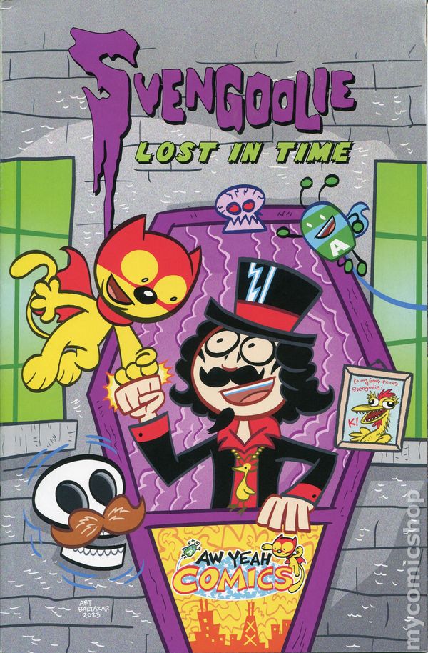 Aw Yeah Comics Exclusive Variant Cover by Art Balthazar. Written by Rich Koz & Various. Art by Chris Jones & Various. In this first of two specials, MeTV sensation Svengoolie appears in his first full length comic book feature, as the evil Svenbot goes to the past to undo Svengoolie's future. Learn the secrets behind Sven, and his crazy cast of friends, Boddy Sorrell, Tombstone and Kerwyn as told by the show's creators Rich (Svengoolie) Koz, Jim Roche and Chris Faulkner. Buy this at your local store and remember, No Personal Checks! 48 pages, full color.